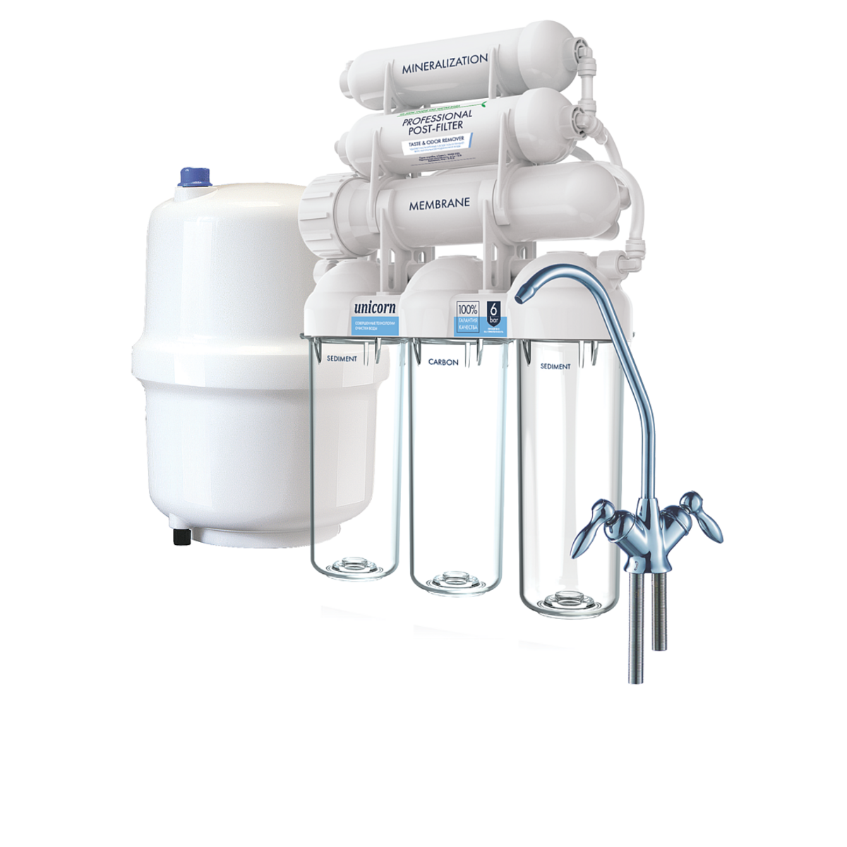 Подготовленная таким образом вода хранится в накопительном баке, откуда поступает к отдельному крану на кухонной мойке.