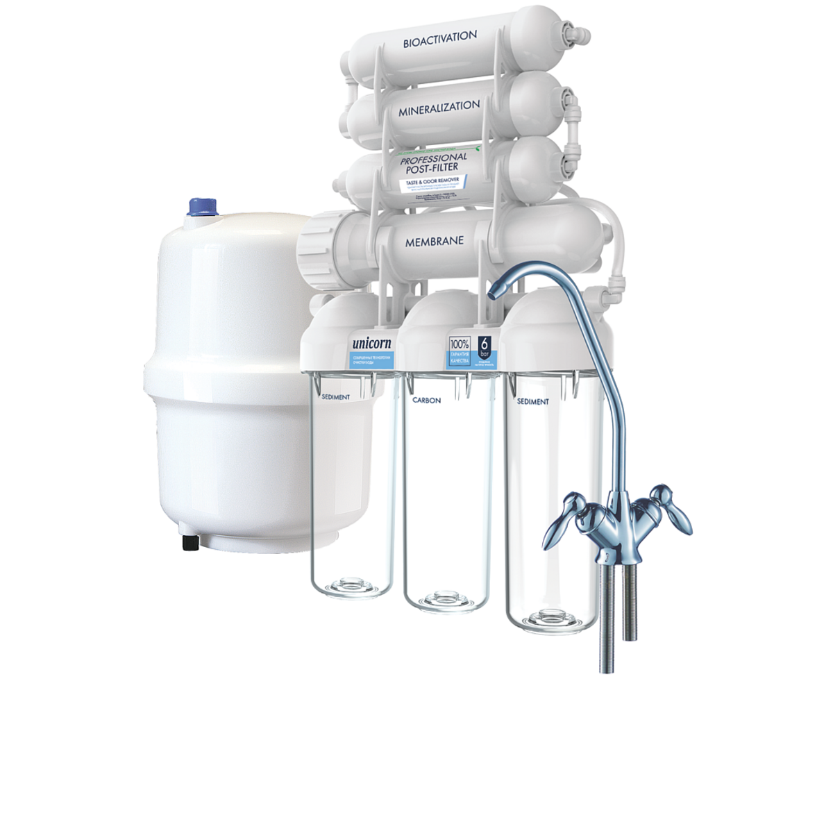 Обратноосмотическая мембрана. Устраняет до 96-99% загрязнений всех типов, в том числе бактерии и вирусы. Срок службы - до 3 лет.
