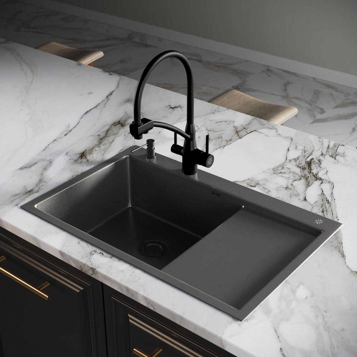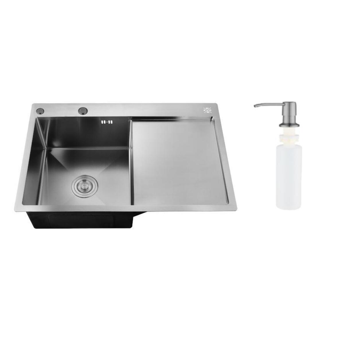 Набор 2 в 1 РМС (кухонная мойка с правым крылом + дозатор врезной). В комплекте: евросифон высокого качества. Металлические элементы изготовленны из нержавеющей стали. Гофра с универсальным выходом 40/50. Цвет: вороненая сталь. Размер: 779*509 мм. Глубина: 180 мм. Толщина: 1-3 мм