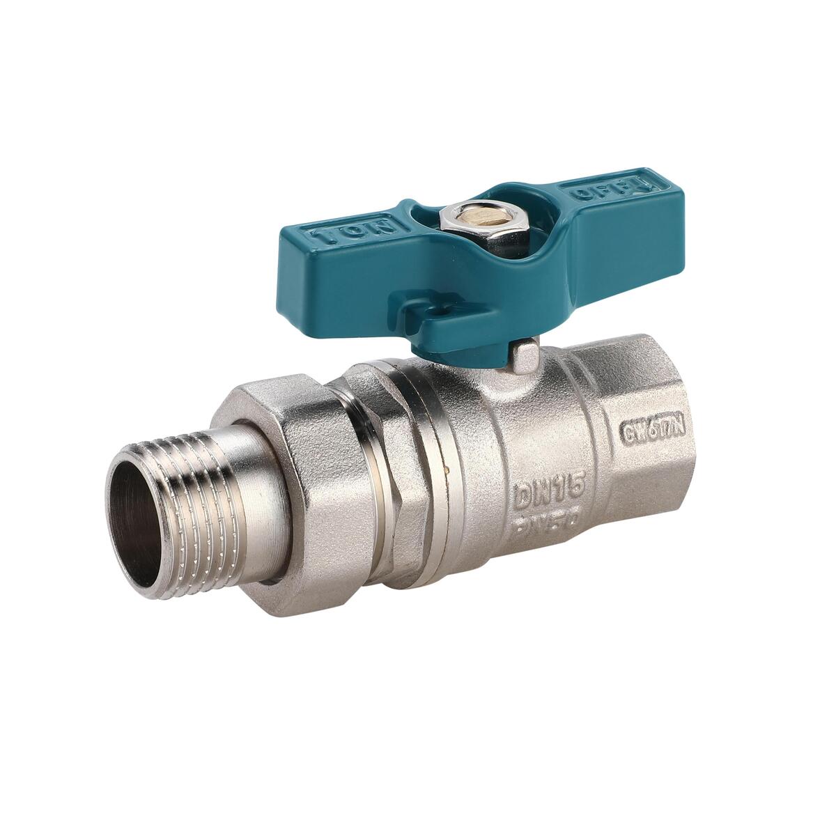 Кран шаровой с полусгоном, с уплотнительным кольцом. Вид: прямой кран.Тип ручки: бабочка. Тип арматуры: запорная. Материал: корпус- латунь,  шарик-латунь. Тип резьбы: 1/2F-1/2М (1/2 гайка-американка). Тип присоединения: резьбовой