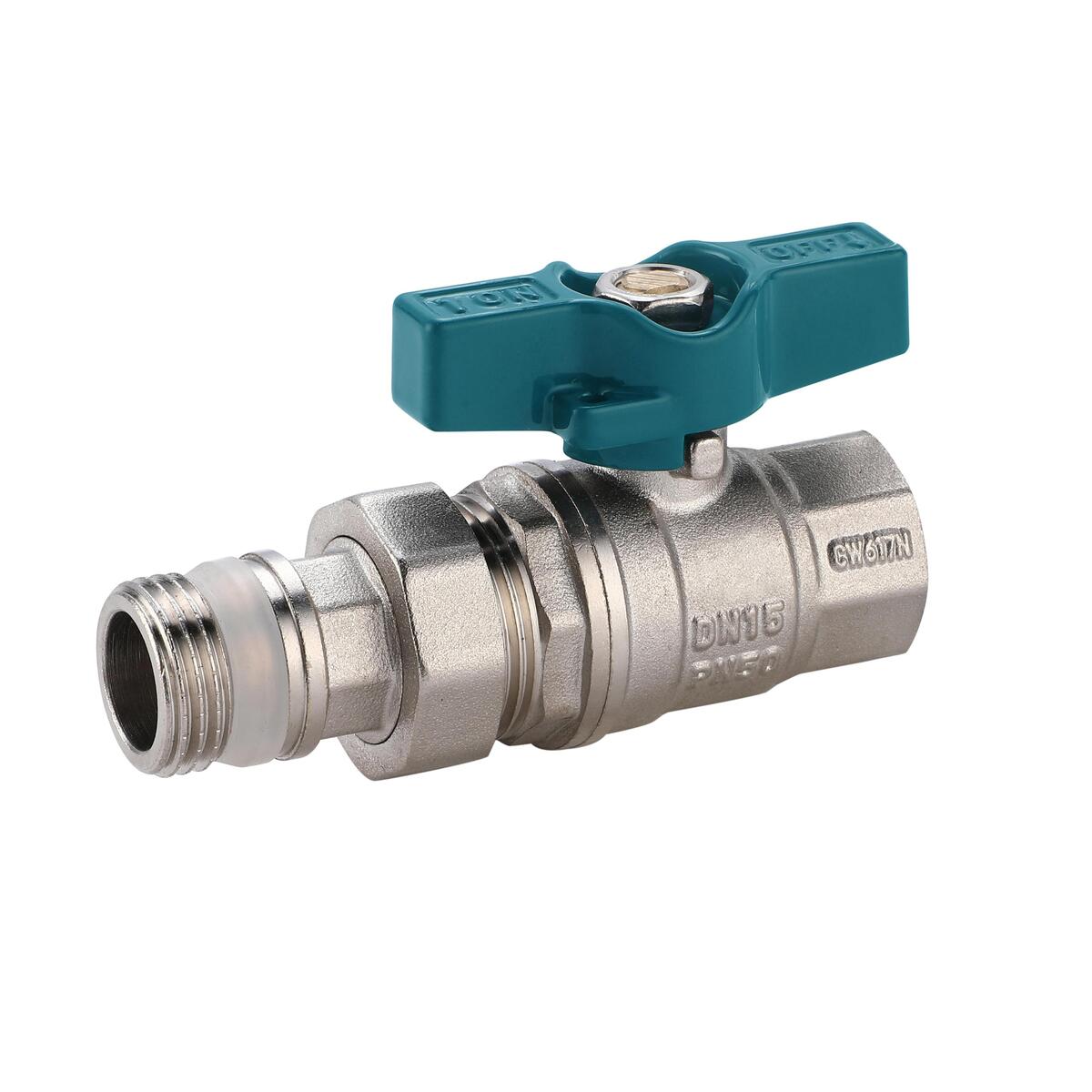 Кран шаровой с полусгоном. Вид: прямой кран.Тип ручки: бабочка. Тип арматуры: запорная. Материал: корпус- латунь,  шарик-латунь. Тип резьбы: 1/2F-1/2М (1/2 гайка-американка). Тип присоединения: резьбовой