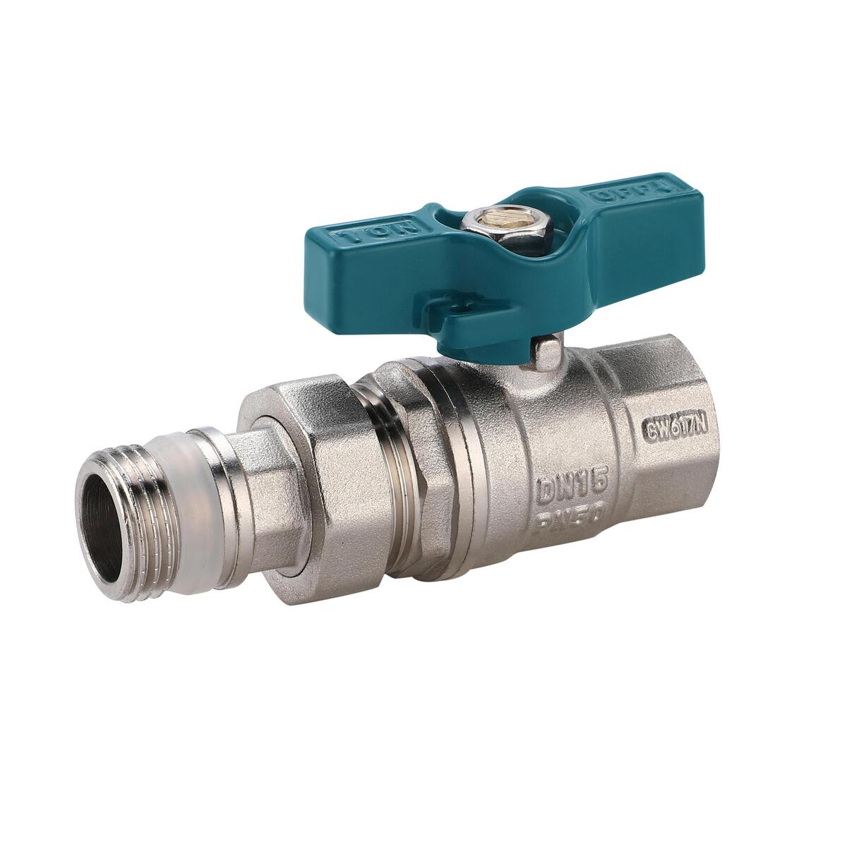 Кран шаровой с полусгоном. Вид: прямой кран.Тип ручки: бабочка. Тип арматуры: запорная. Материал: корпус- латунь,  шарик-латунь. Тип резьбы: 3/4F-3/4М (3/4 гайка-американка). Тип присоединения: резьбовой