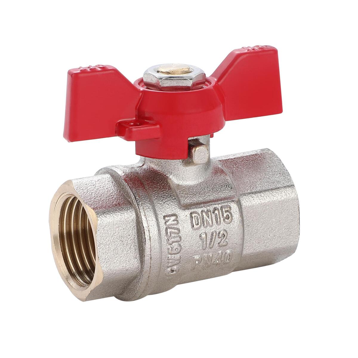Кран шаровой. Вид: прямой кран. Назначение: вода. Тип ручки: бабочка. Тип арматуры: запорная. Материал: корпус- латунь,  шарик-латунь. Тип резьбы: 1/2F-1/2F (1/2 гайка-гайка). Тип присоединения: резьбовой