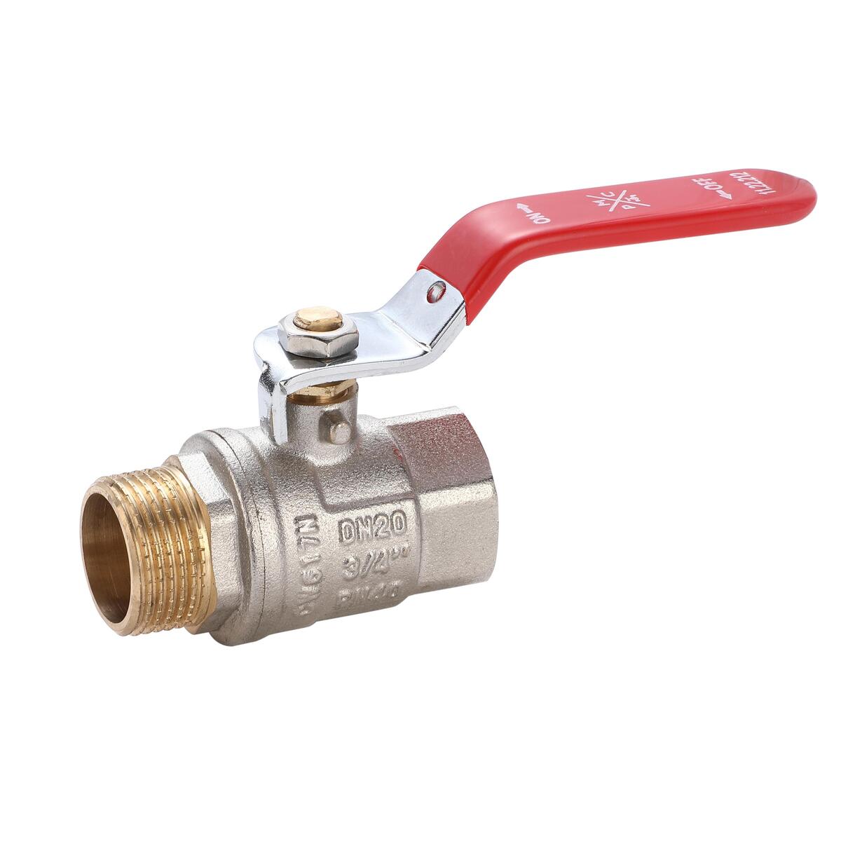 Кран шаровой. Вид: прямой кран. Назначение: вода. Тип ручки: ручка. Тип арматуры: запорная. Материал: корпус- латунь,  шарик-латунь. Тип резьбы: 1/2F-1/2М (1/2 гайка-штуцер). Тип присоединения: резьбовой