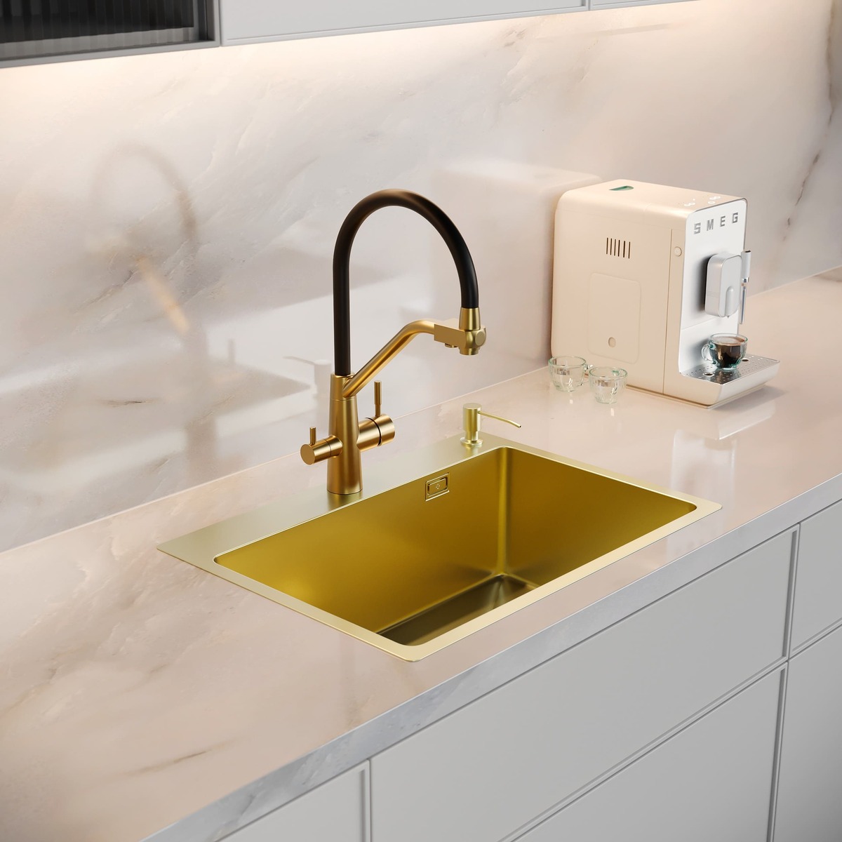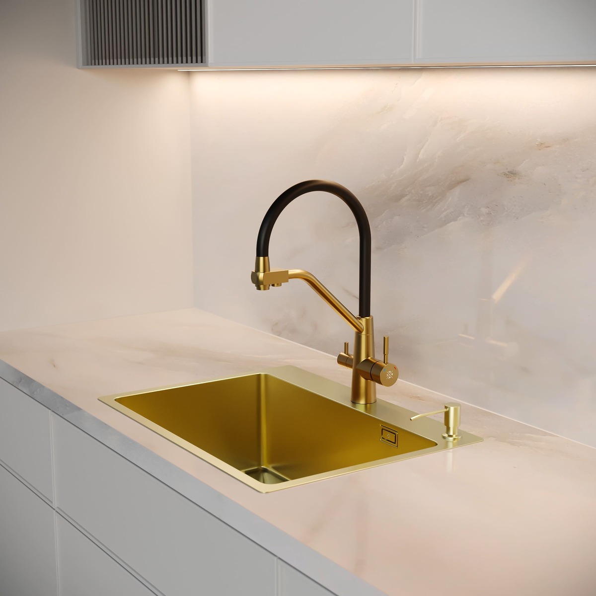 Добавить мойке функциональности поможет встраиваемый дозатор для чистящего средства. Также дозатор экономит пространство рабочей поверхности: после встраивания снаружи остается только его подвижная часть. Емкость для моющего средства располагается внизу и может быть разного объема.