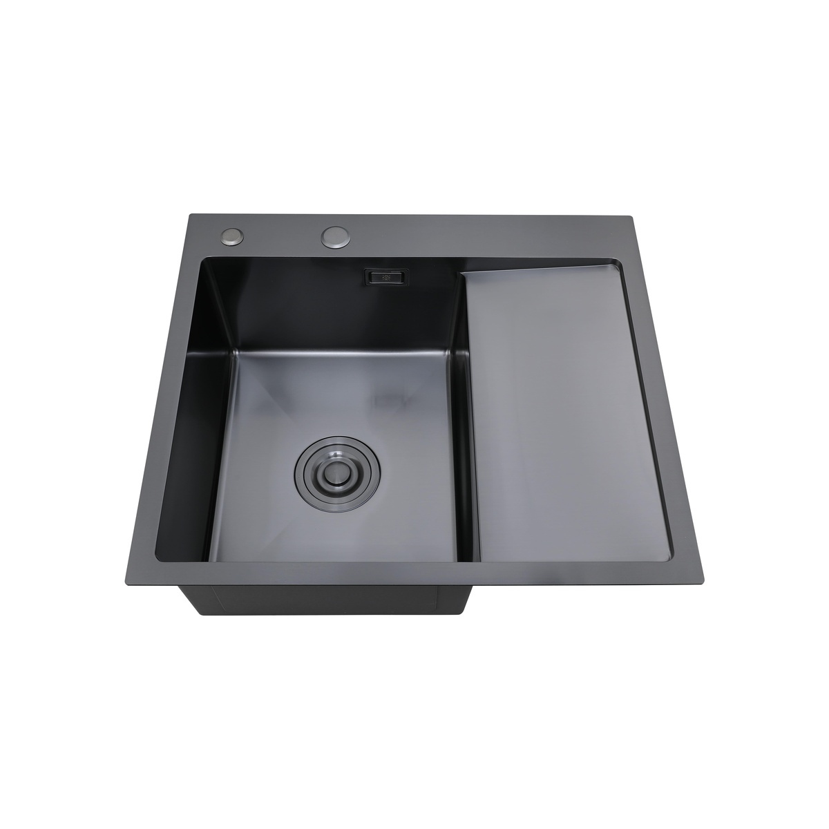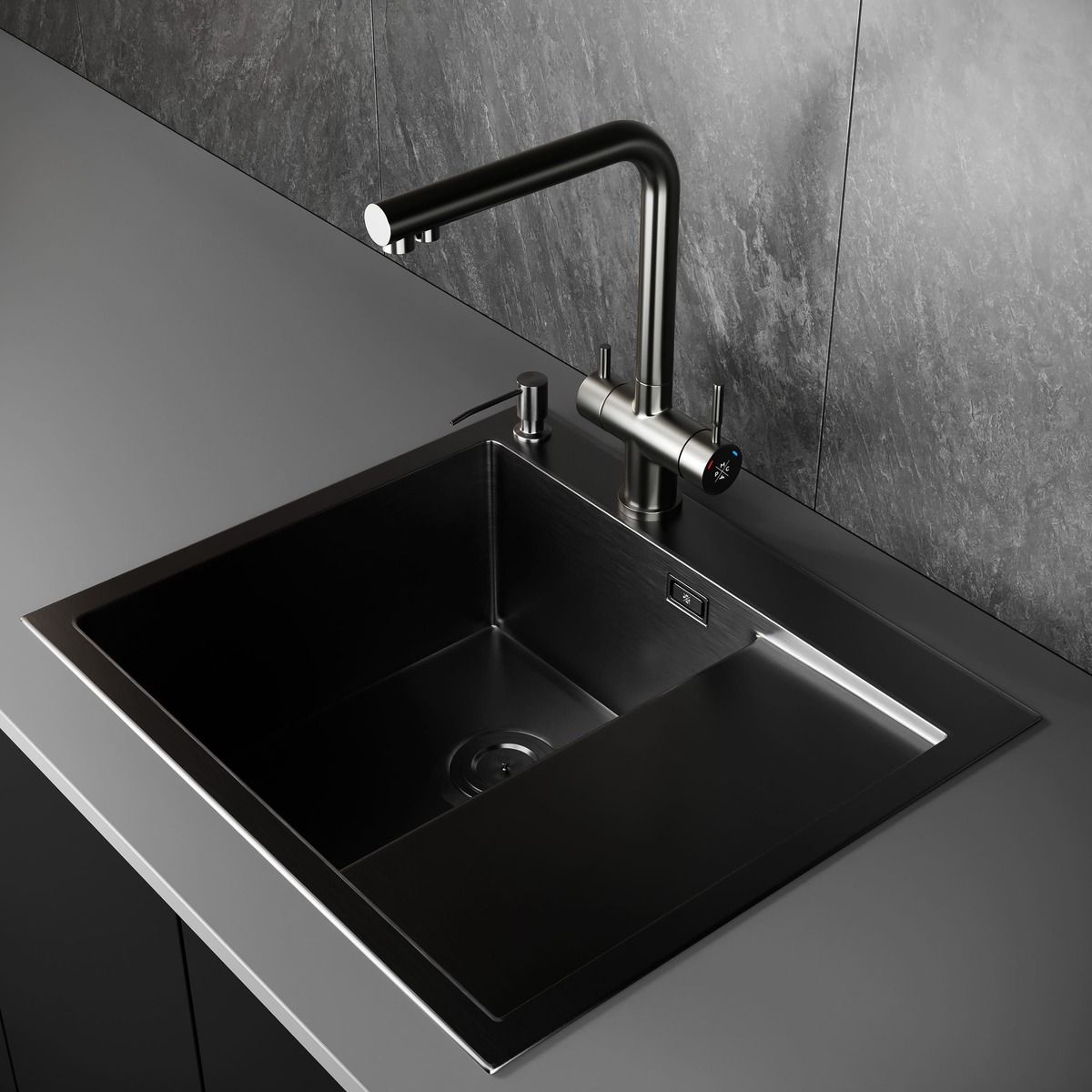Набор 2 в 1 РМС (кухонная мойка с правым крылом +  дозатор врезной). В комплекте: евросифон высокого качества. Металлические элементы изготовленны из нержавеющей стали. Гофра с универсальным выходом 40/50. Цвет: вороненая сталь. Размер: 580*510 мм. Глубина:180 мм. Толщина: 1-3 мм