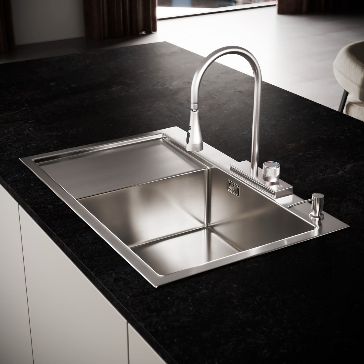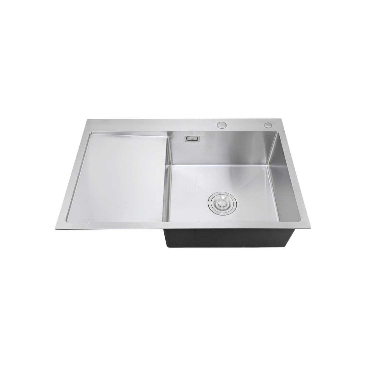 Набор 2 в 1 РМС (кухонная мойка с левым крылом, выполнена из премиальной нержавеющей стали +  дозатор врезной). В комплекте: евросифон высокого качества. Металлические элементы изготовленны из нержавеющей стали. Гофра с универсальным выходом 40/50. Цвет: нержавеющая сталь. Размер: 779*509 мм. Глубина: 180 мм. Толщина: 1-3 мм