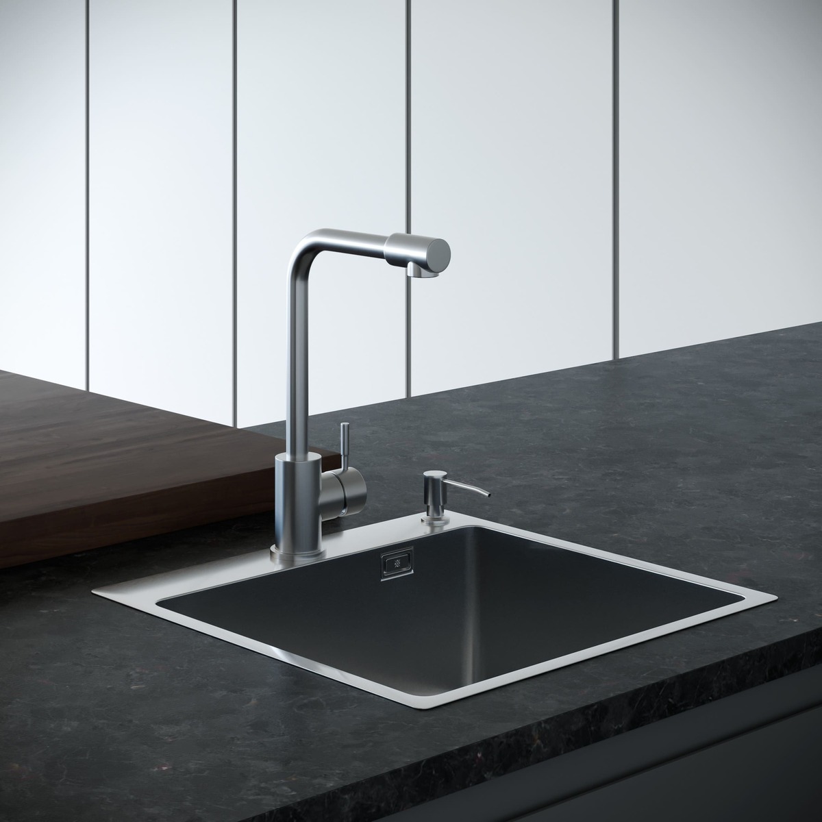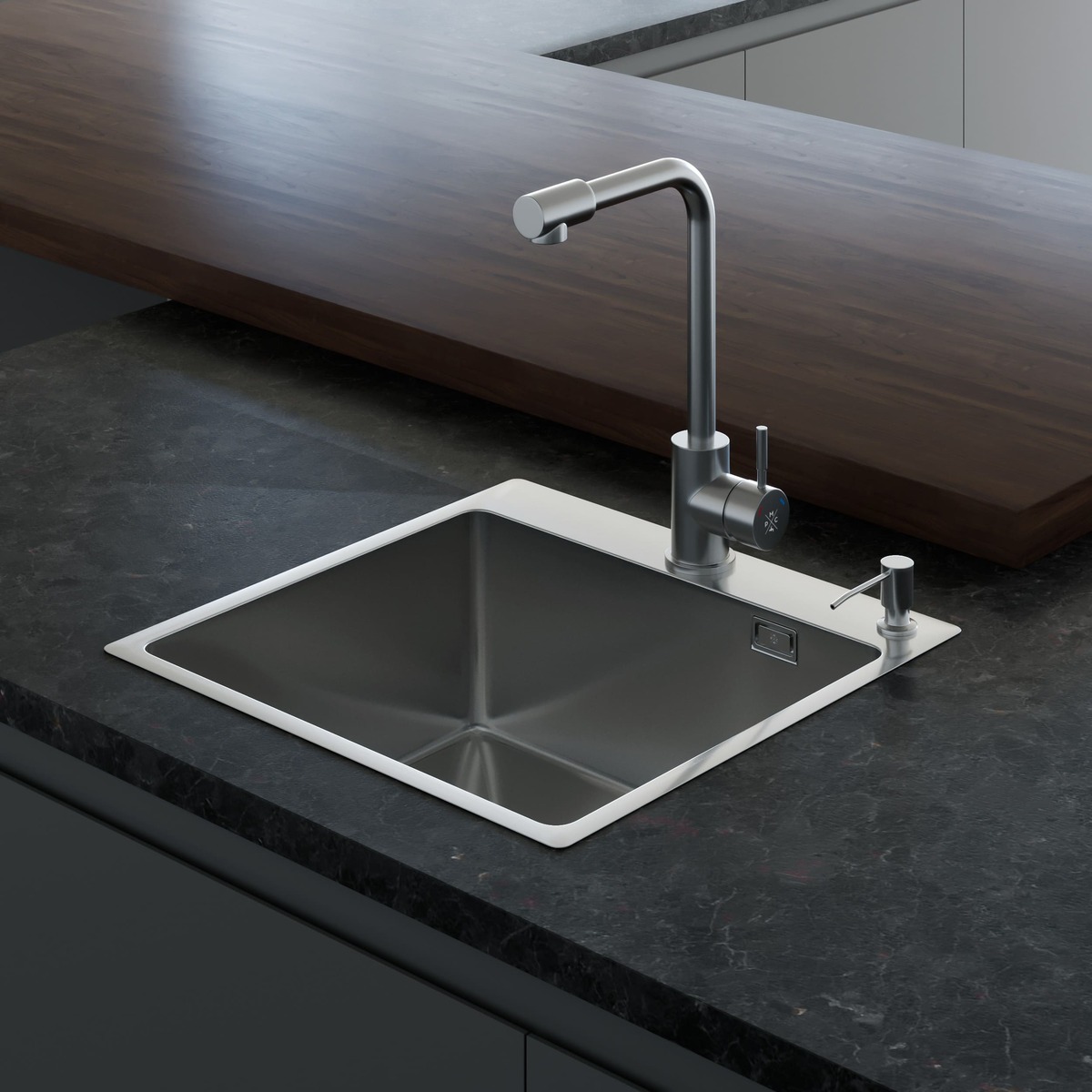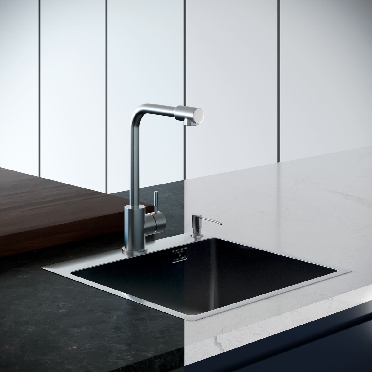 Ещё один плюс набора — это врезной дозатор. Его устанавливают вместе с раковиной. Не скользит. Не падает. Не портит дизайн кухни яркой этикеткой. А лаконично спрятан в мойку: диспенсер внизу, подвижный носик снаружи. После свежего ремонта хочется уберечь кухню от визуального шума.