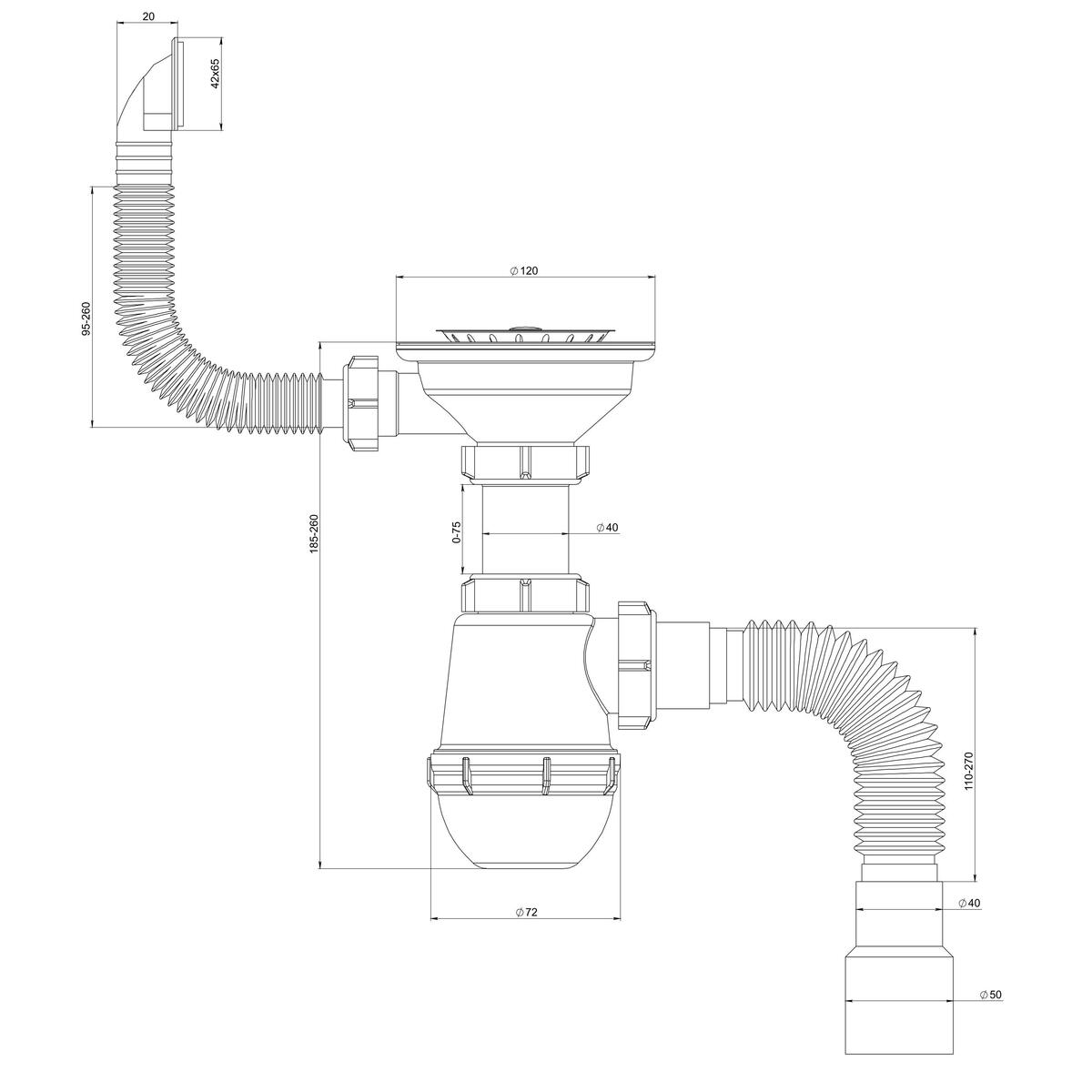Сифон для мойки. Выпуск 1 ½ (40), прямоугольный перелив, латунный шток, чашка из нержавеющей стали 115, гибкий отвод в канализацию 40х40/50