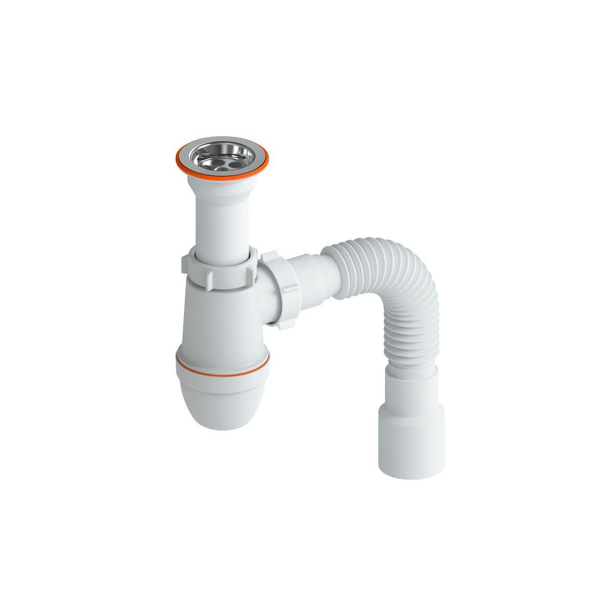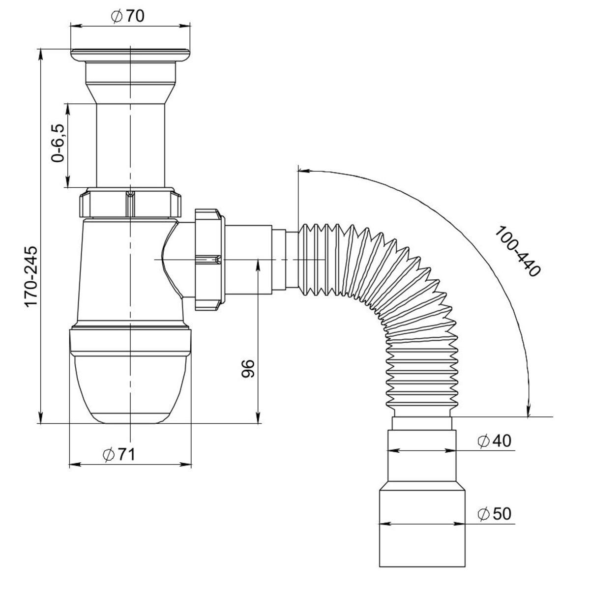 Сифон для тюльпана, умывальника. Литой выпуск 1 ½ (40), винт 6х80, чашка из нержавеющей стали, гибкий отвод в канализацию 40х40/50