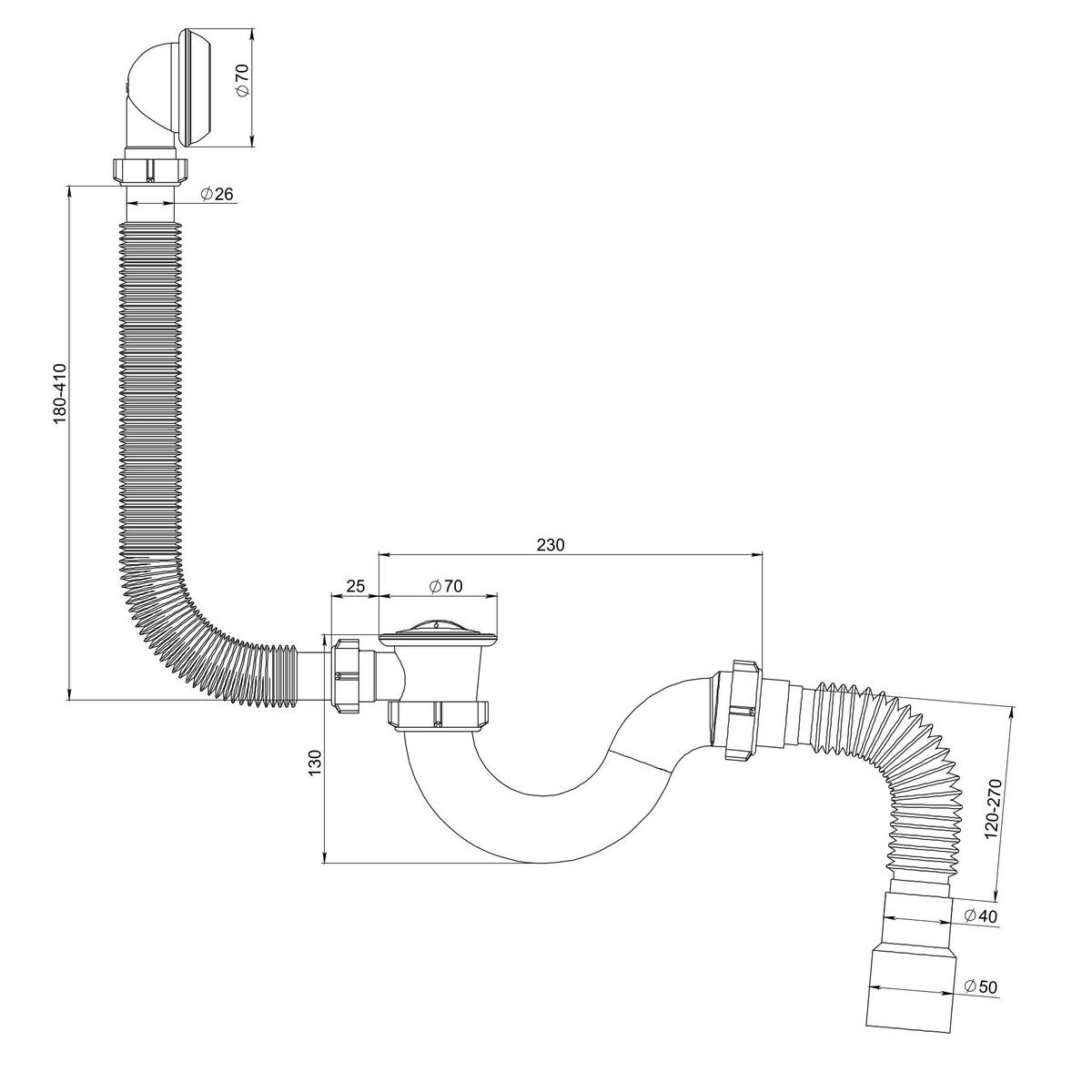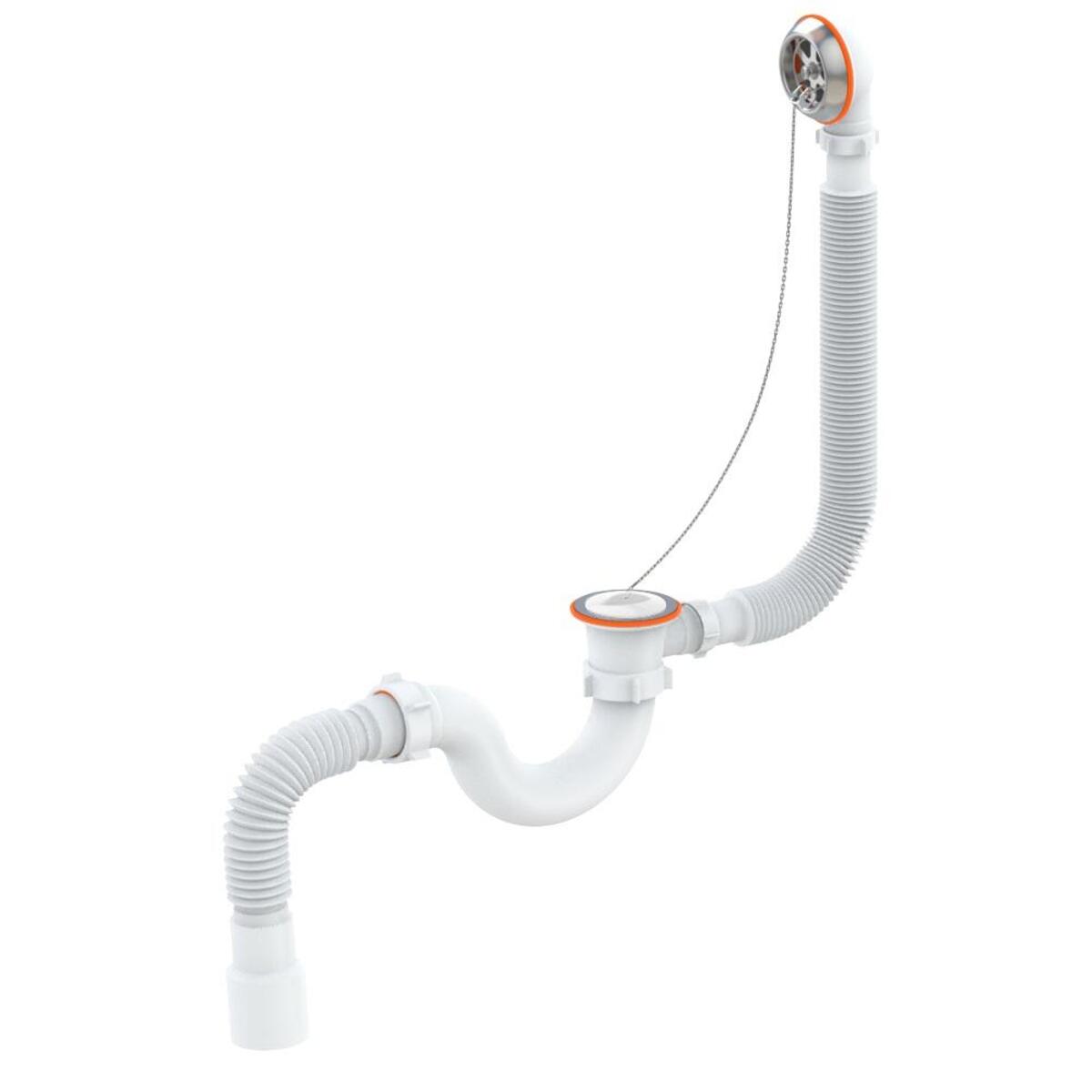 Сифон для ванны и глубокого поддона. Перелив, винты 6х40, чашки из нержавеющей стали, цепочка, пробка, гибкий отвод в канализацию 40х40/50 400 мм