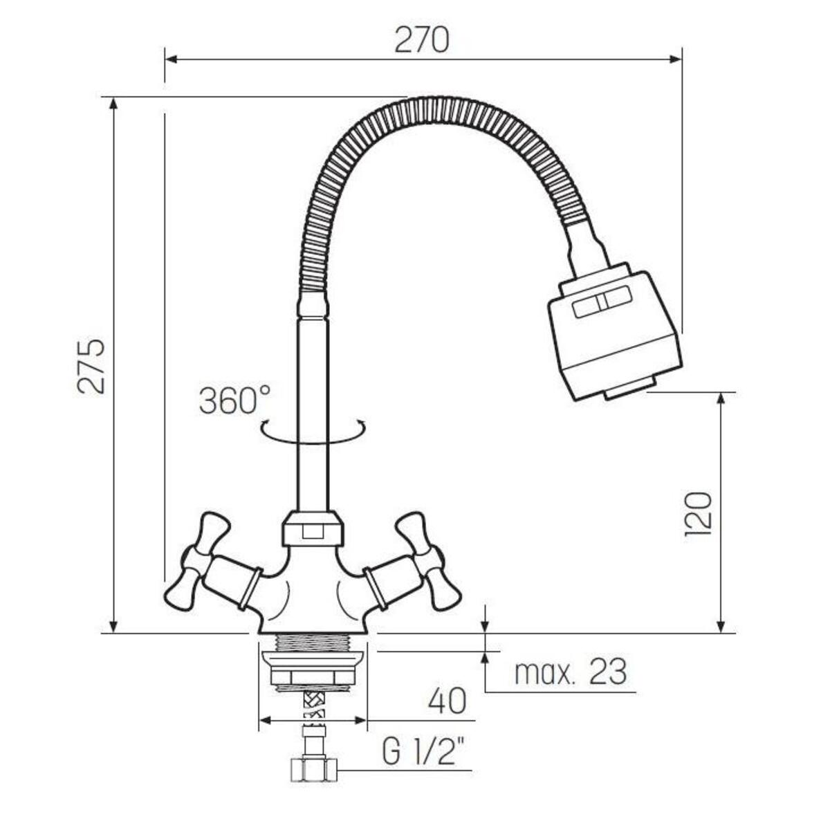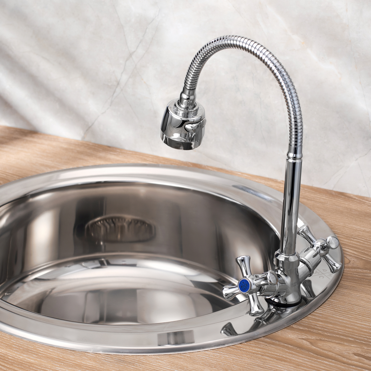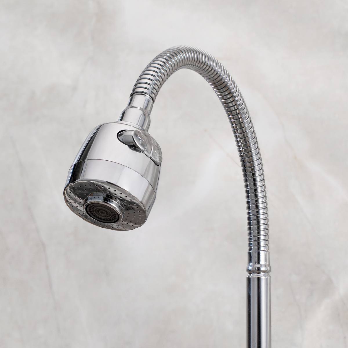 Смеситель для кухни с гибким изливом. Кран-букса латунная с керамическими пластинами угол поворота 180 градусов . Поворотный излив. Аэратор: пластиковый. Покрытие: хром. Крепление: гайка. В комплекте: гибкая подводка