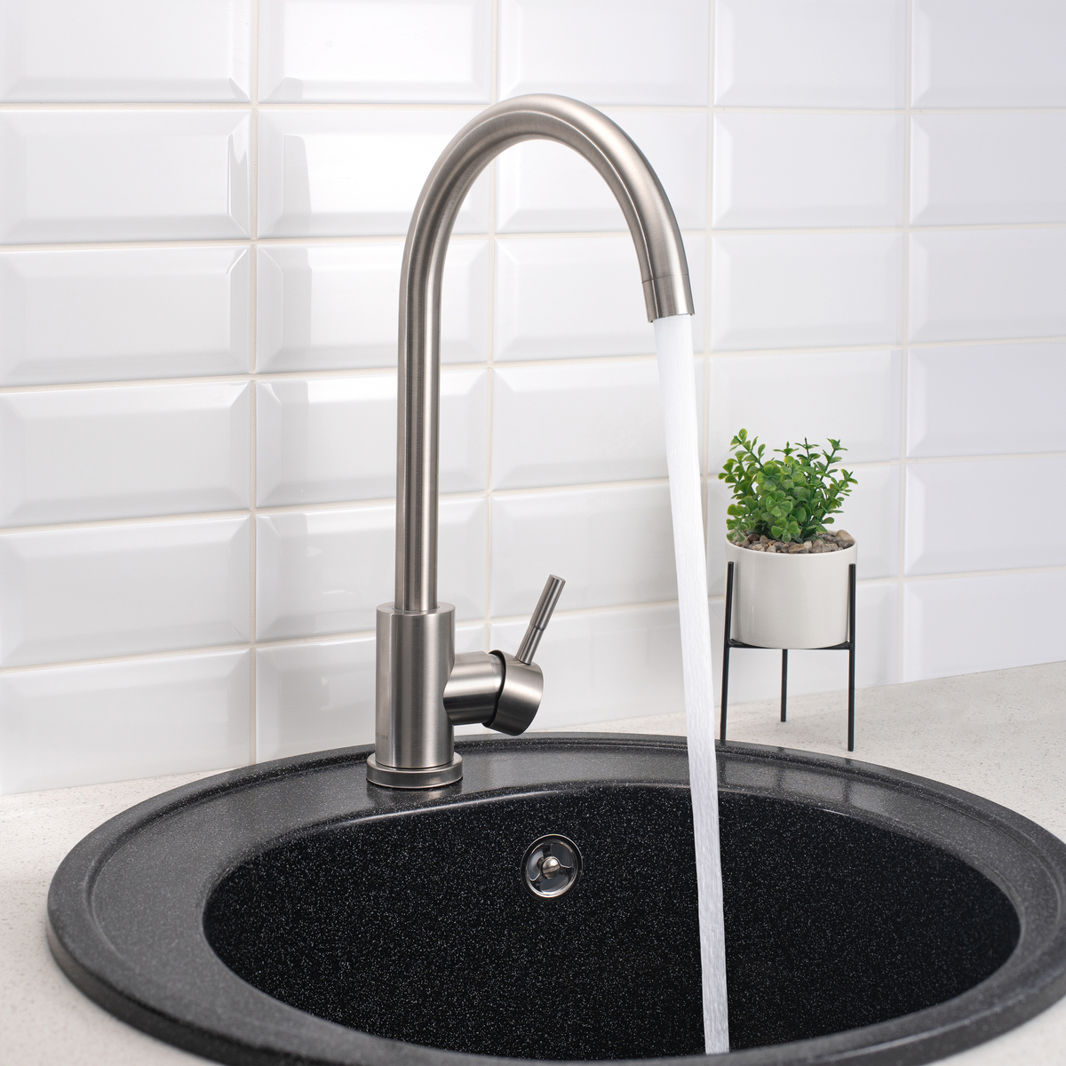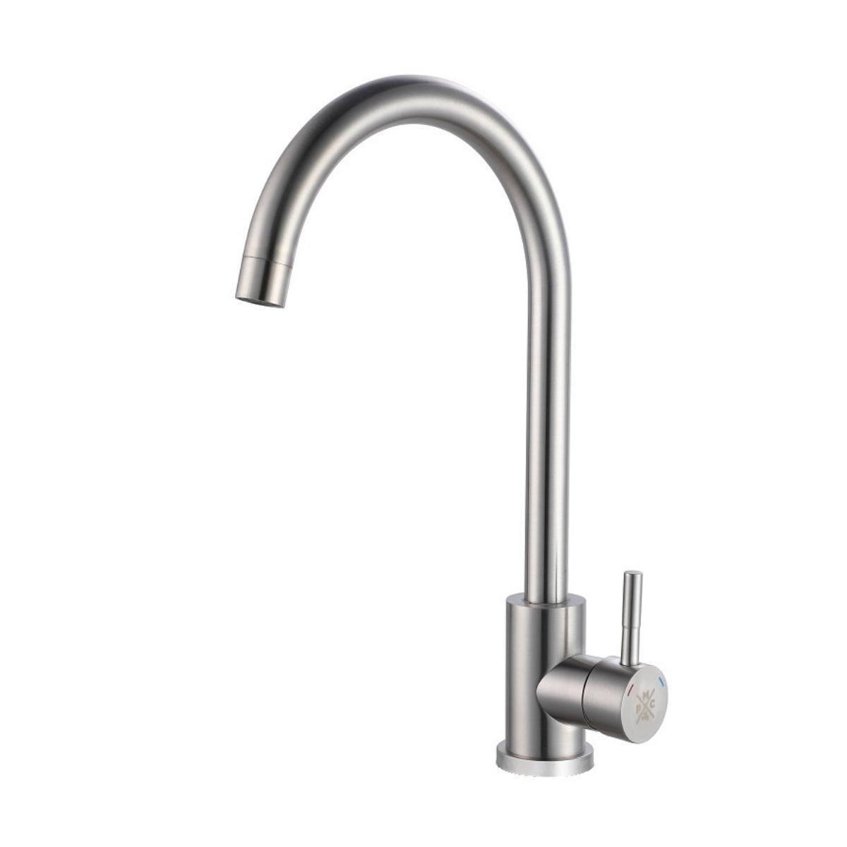 Стильный одноручковый смеситель для кухни из нержавеющей стали с высоким изливом прекрасно подойдет для мойки любого размера.