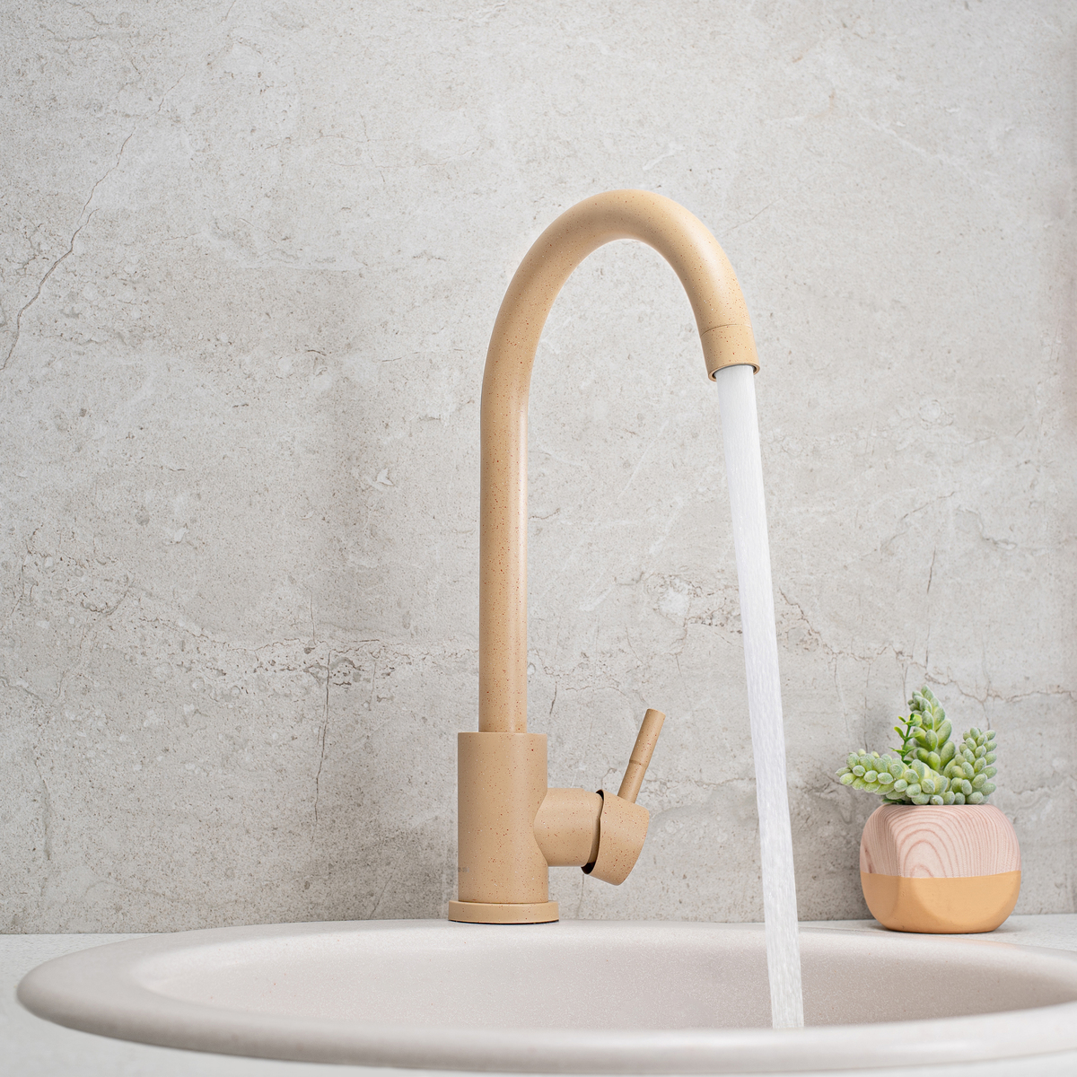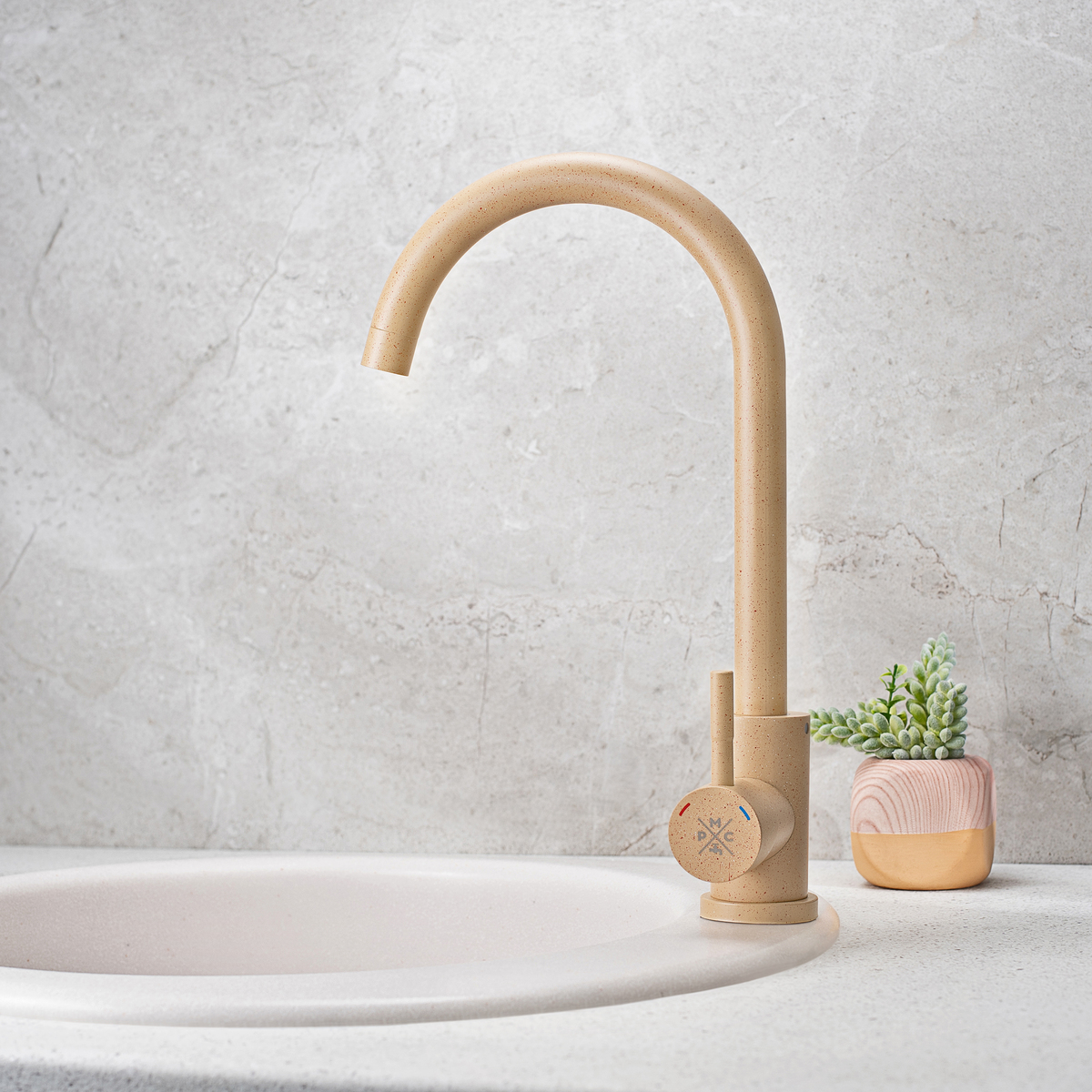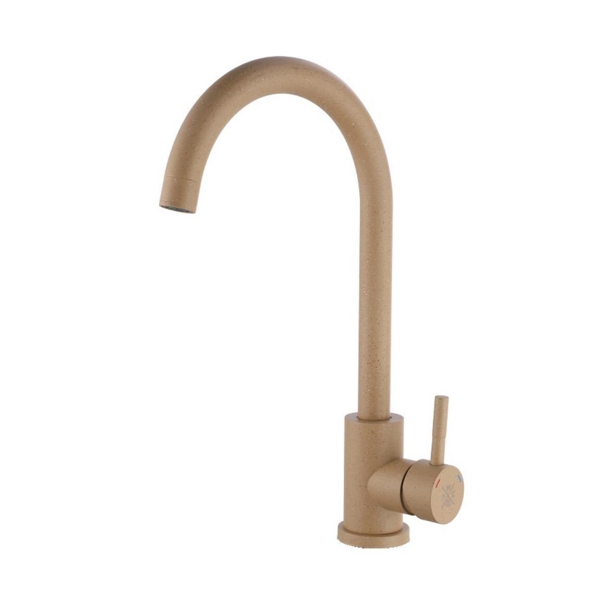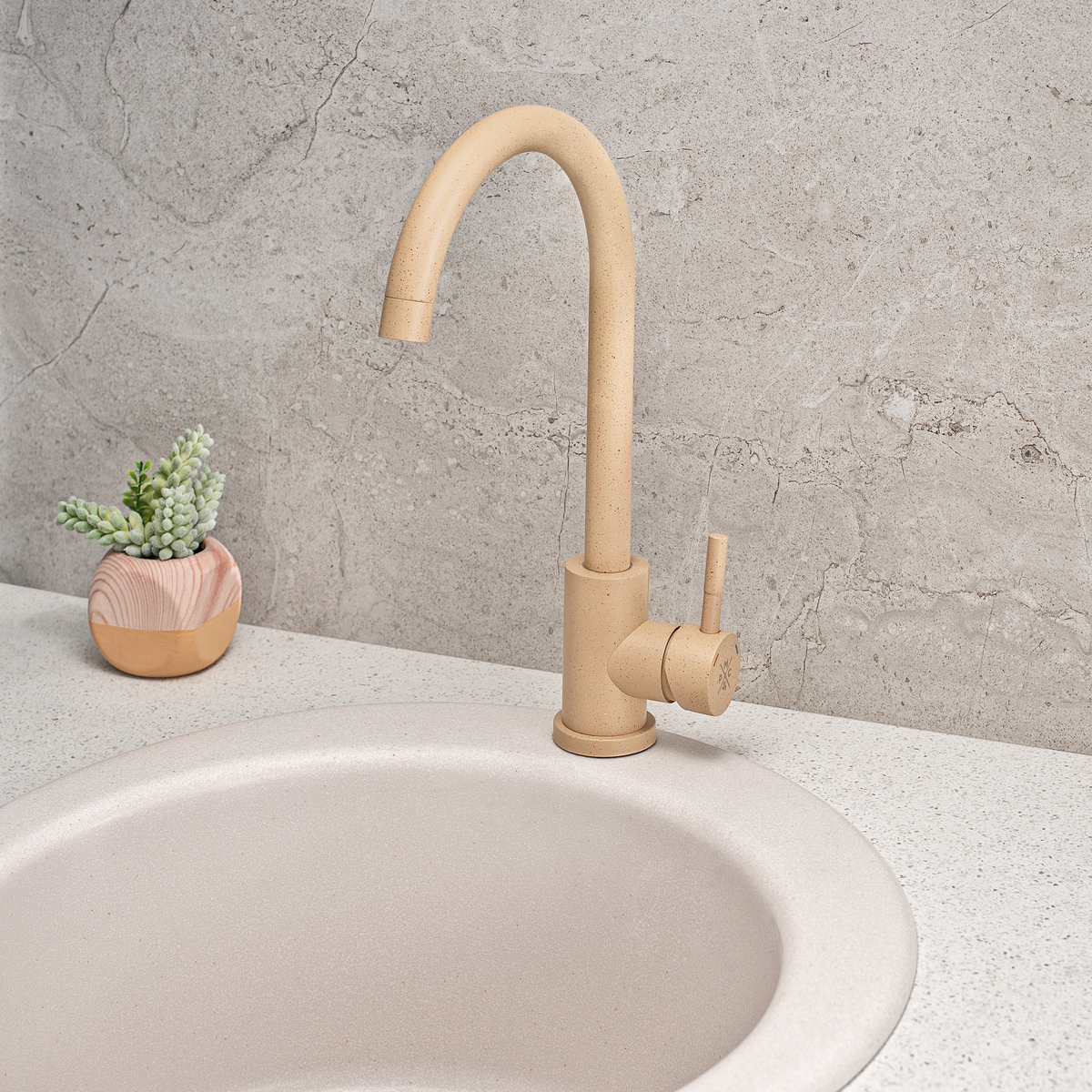 Стильный одноручковый смеситель для кухни из нержавеющей стали с высоким изливом прекрасно подойдет для мойки любого размера.