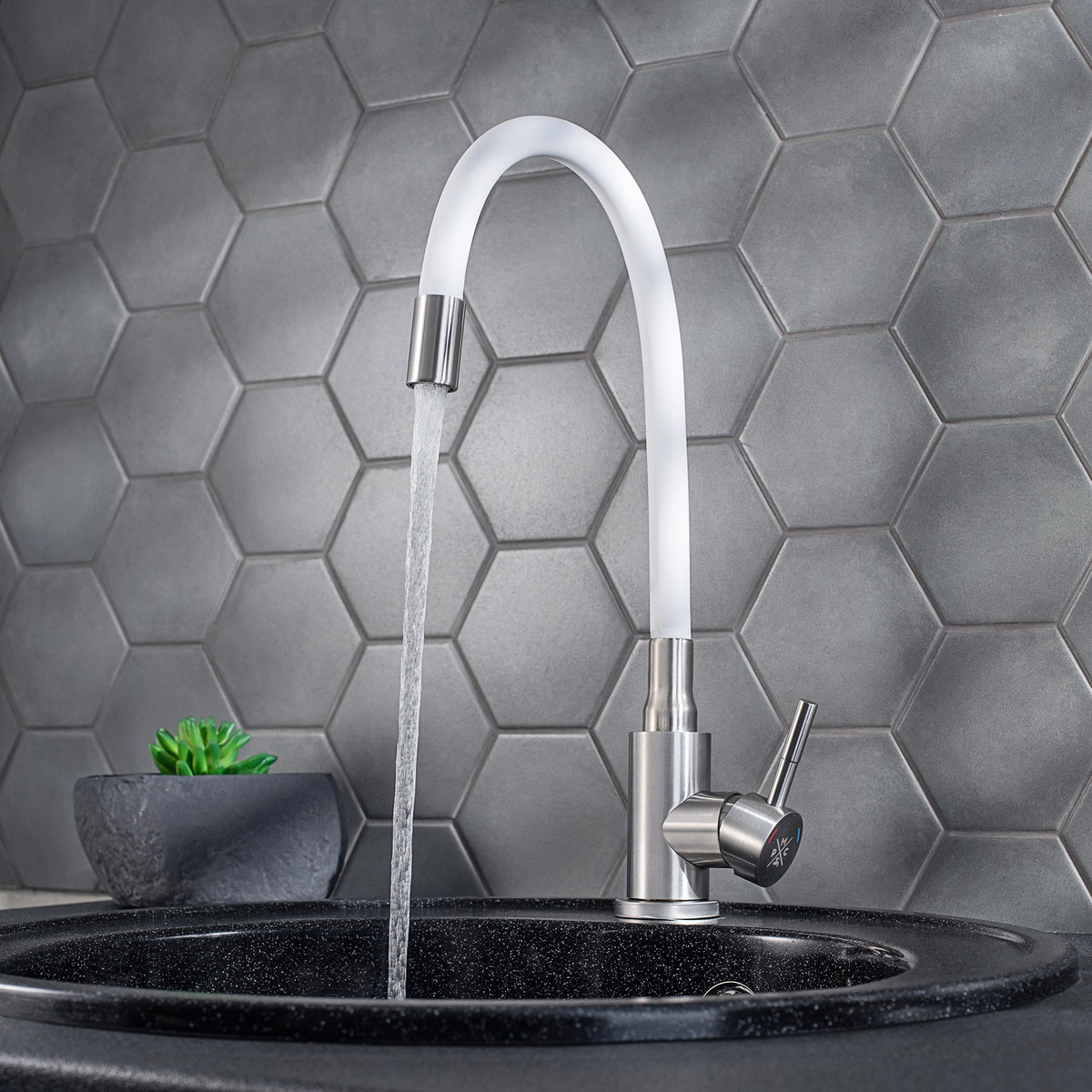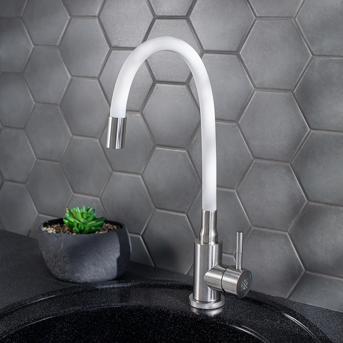 Одноручковый смеситель для кухни из нержавеющей стали с гибким изливом прост и удобен в использовании.