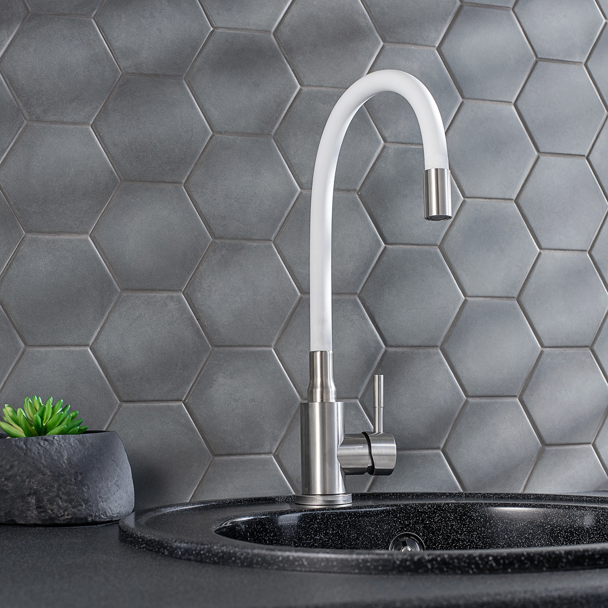 Смеситель для кухни с высоким гибким изливом