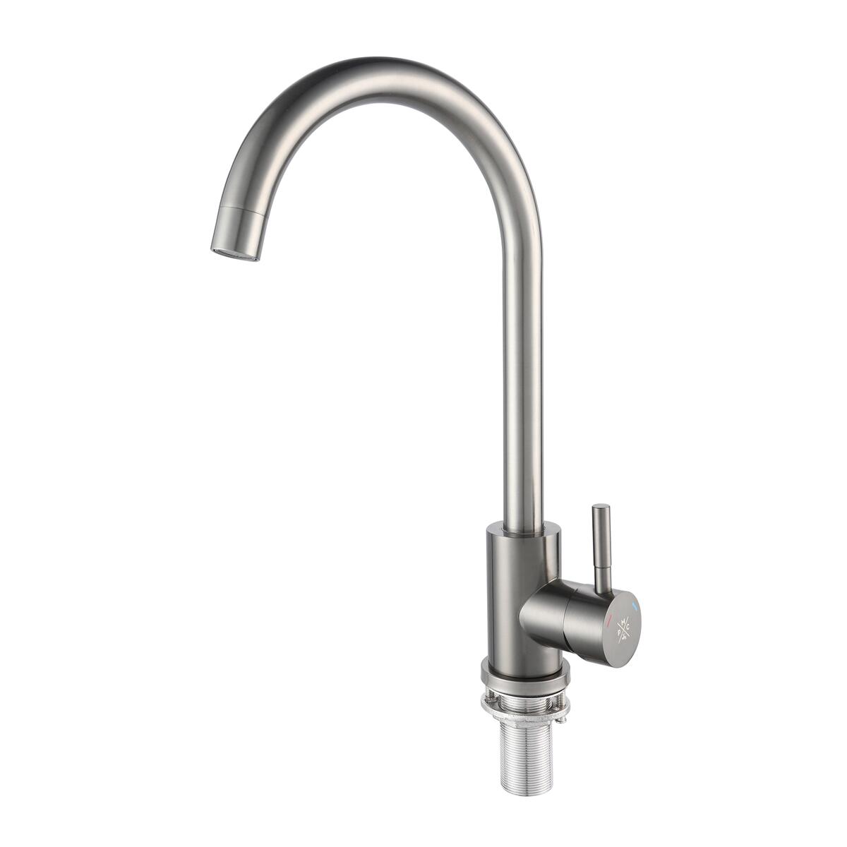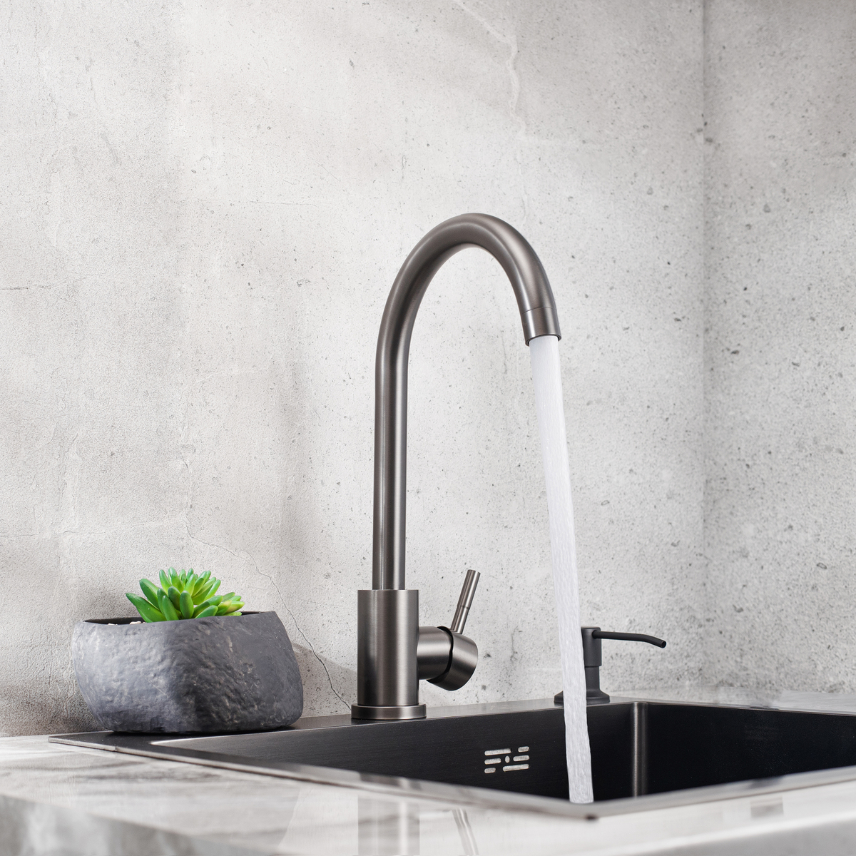 Стильный одноручковый смеситель для кухни из нержавеющей стали с высоким изливом прекрасно подойдет для мойки любого размера.