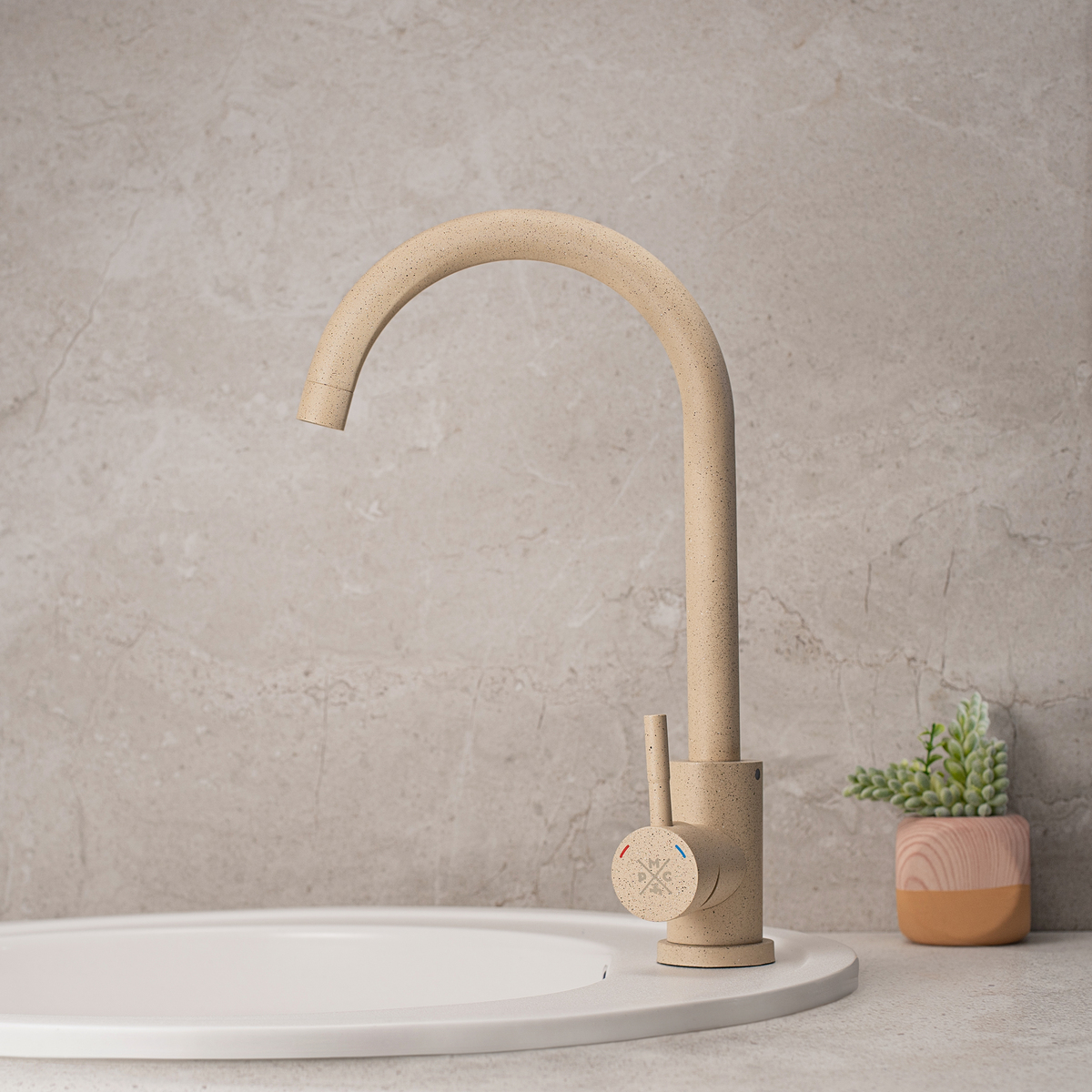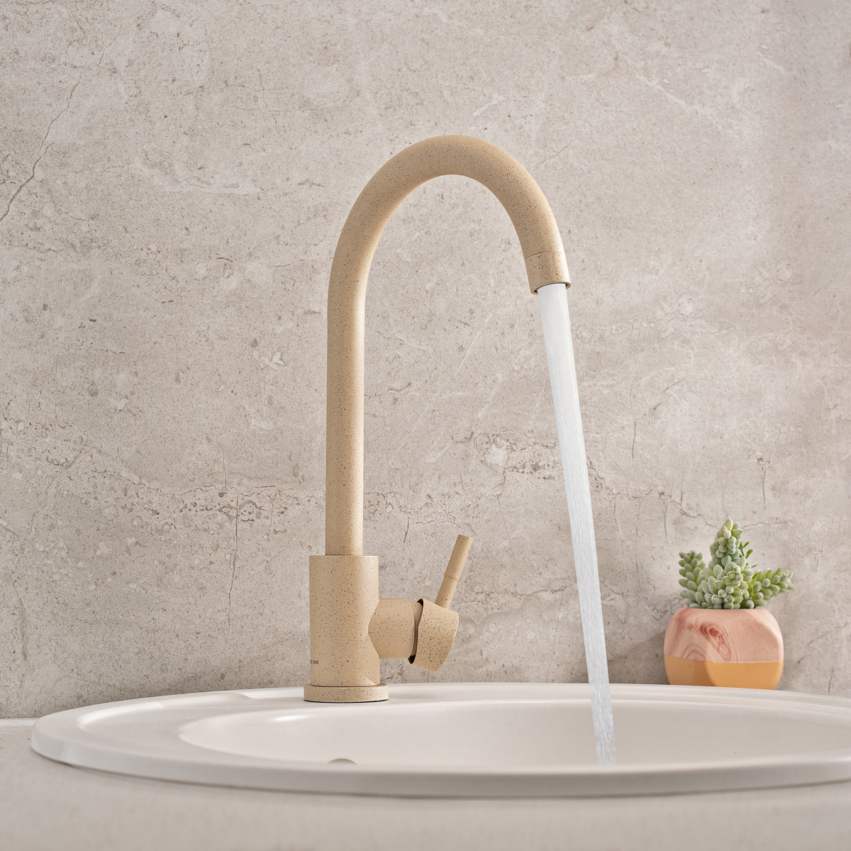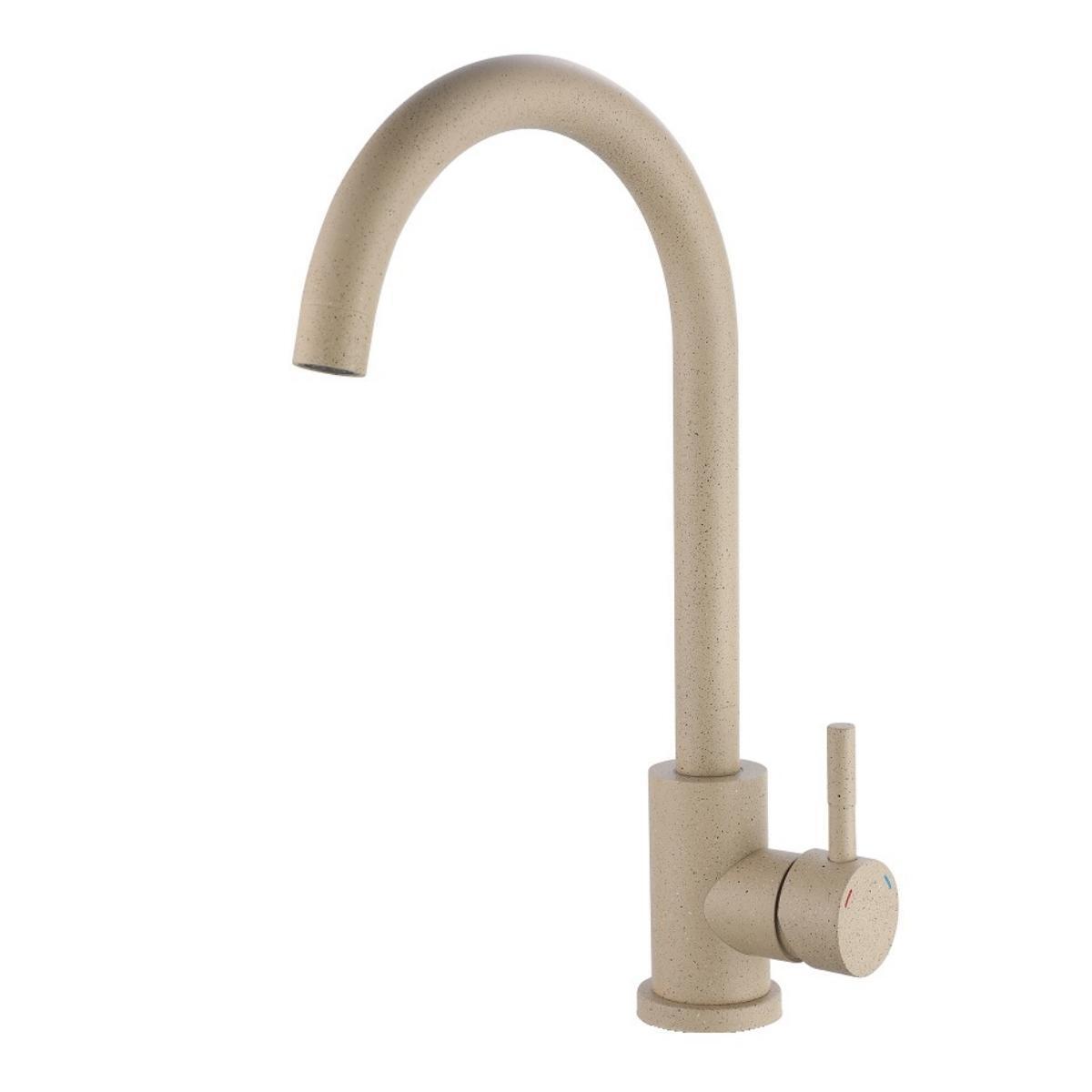 Стильный одноручковый смеситель для кухни из нержавеющей стали с высоким изливом прекрасно подойдет для мойки любого размера.