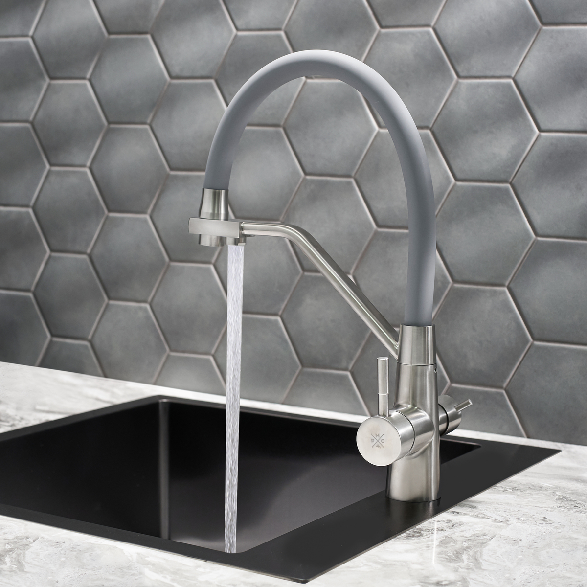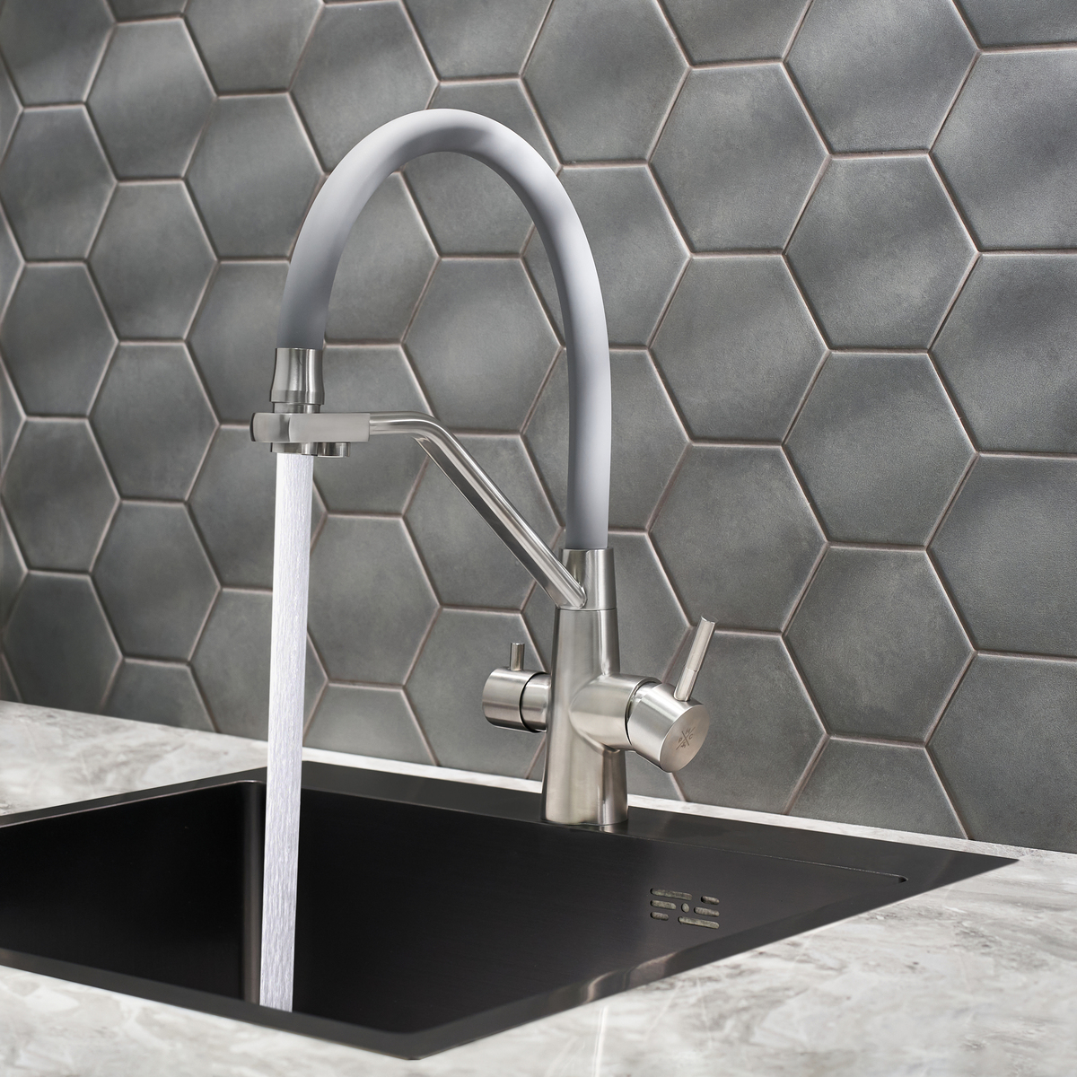 Смеситель для кухни с переключением фильтра для питьевой воды с высоким поворотным изливом.
