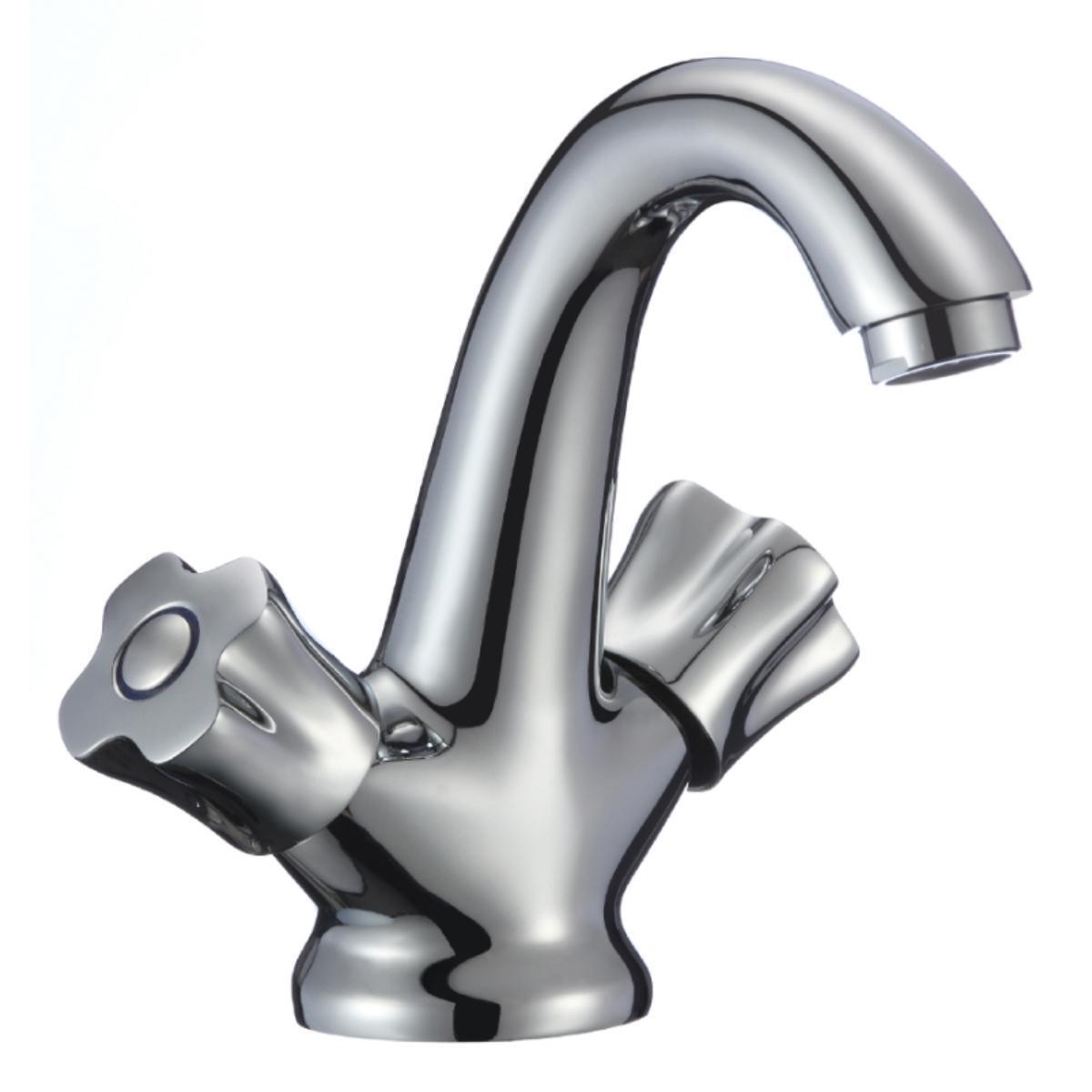 Привлекательный двуручковый смеситель для умывальника обладает удобными в использовании ручками регулирования температуры и напора воды.