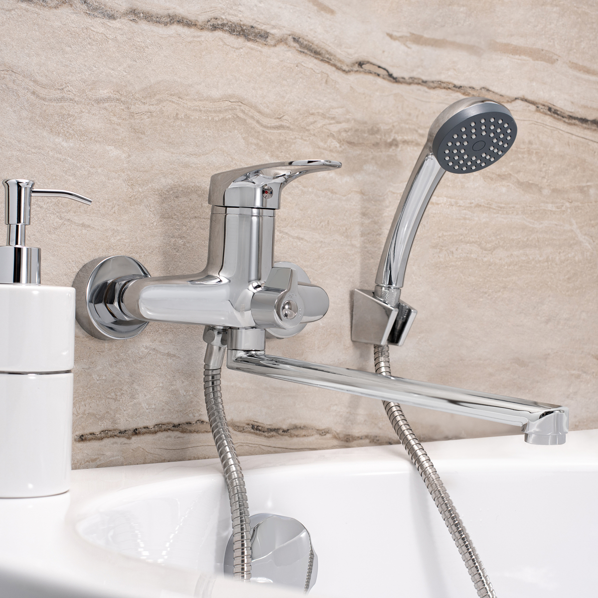Однорычажный настенный смеситель для ванны с длинным поворотным изливом надежен и эффективен в использовании, а также эффектно подчеркнет дизайн интерьера.