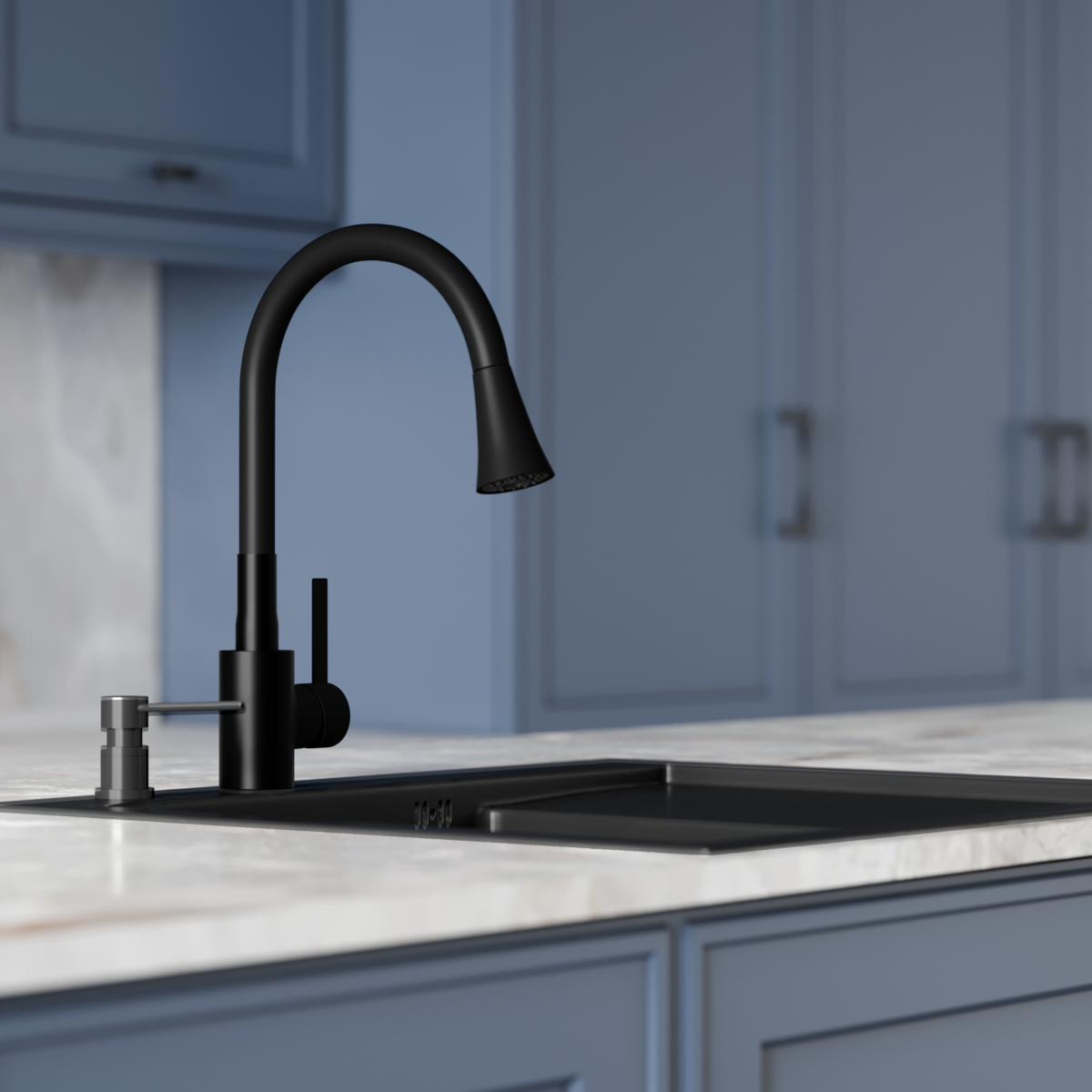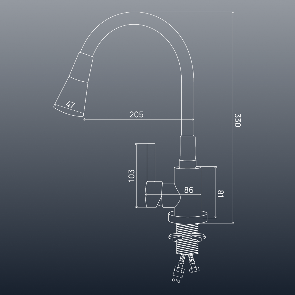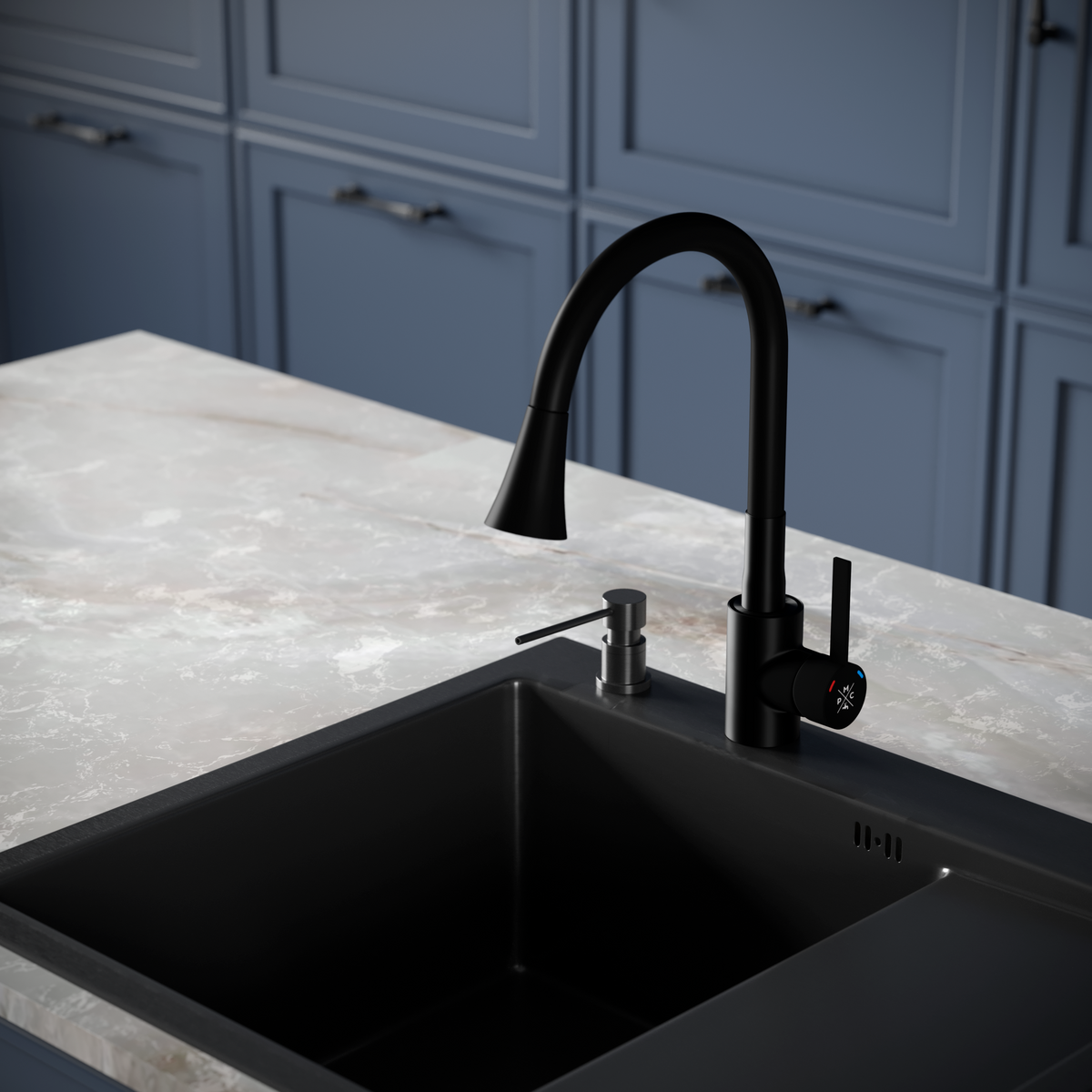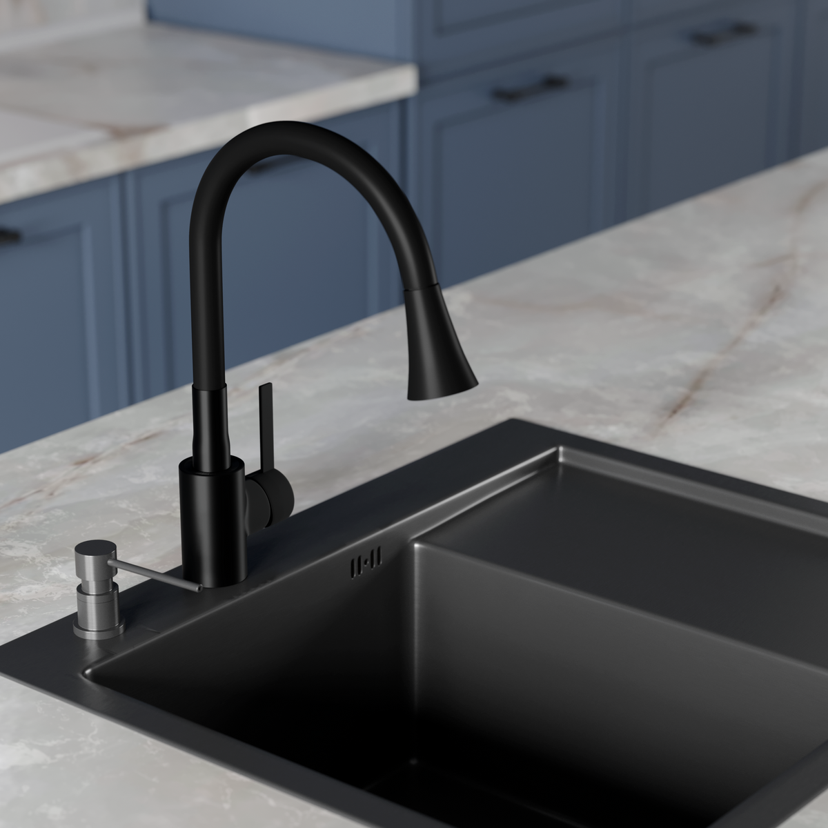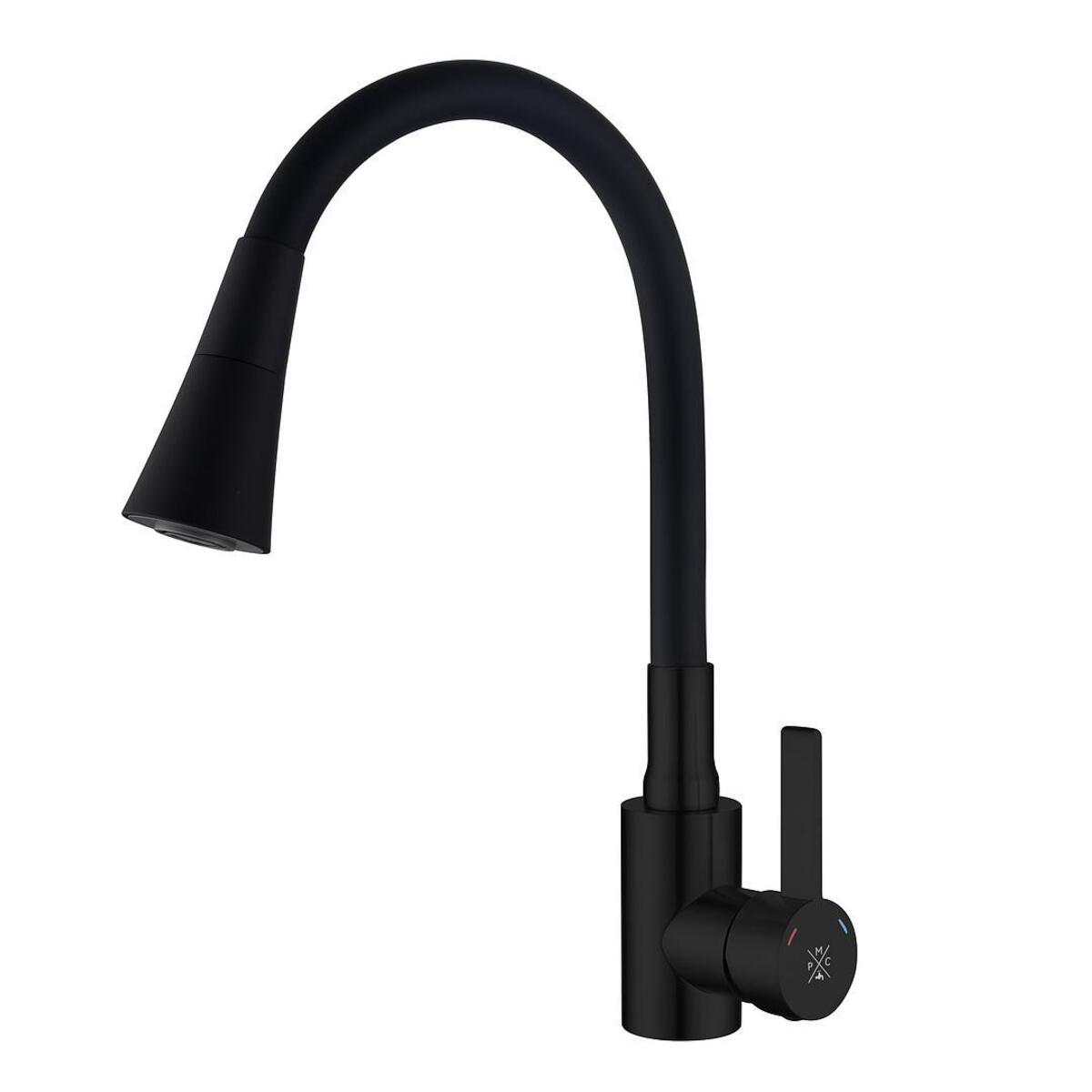 Одноручковый смеситель для кухни из нержавеющей стали с гибким изливом прост и удобен в использовании.