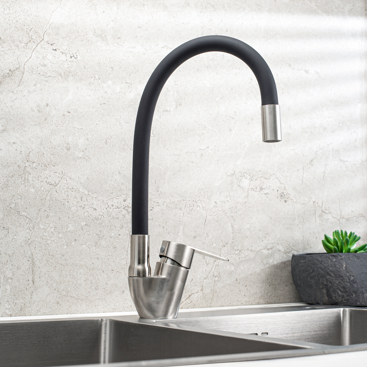 Смеситель для кухни с высоким гибким изливом.